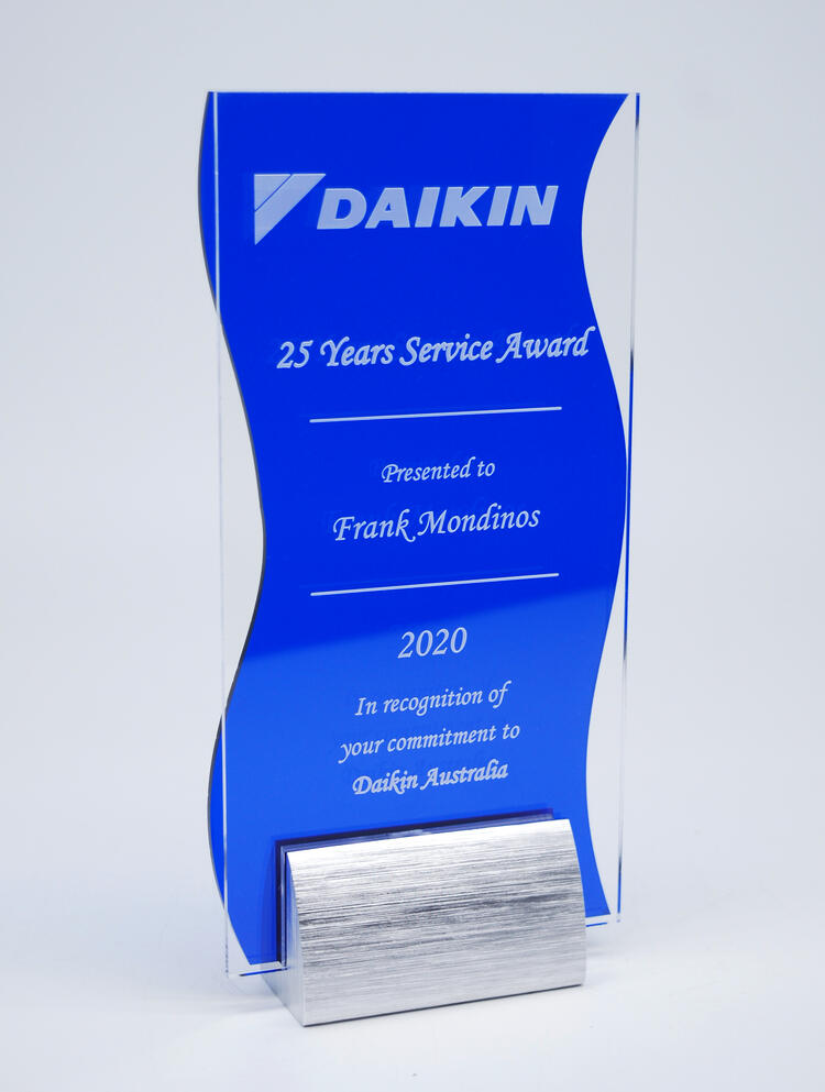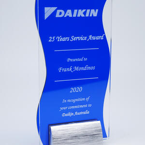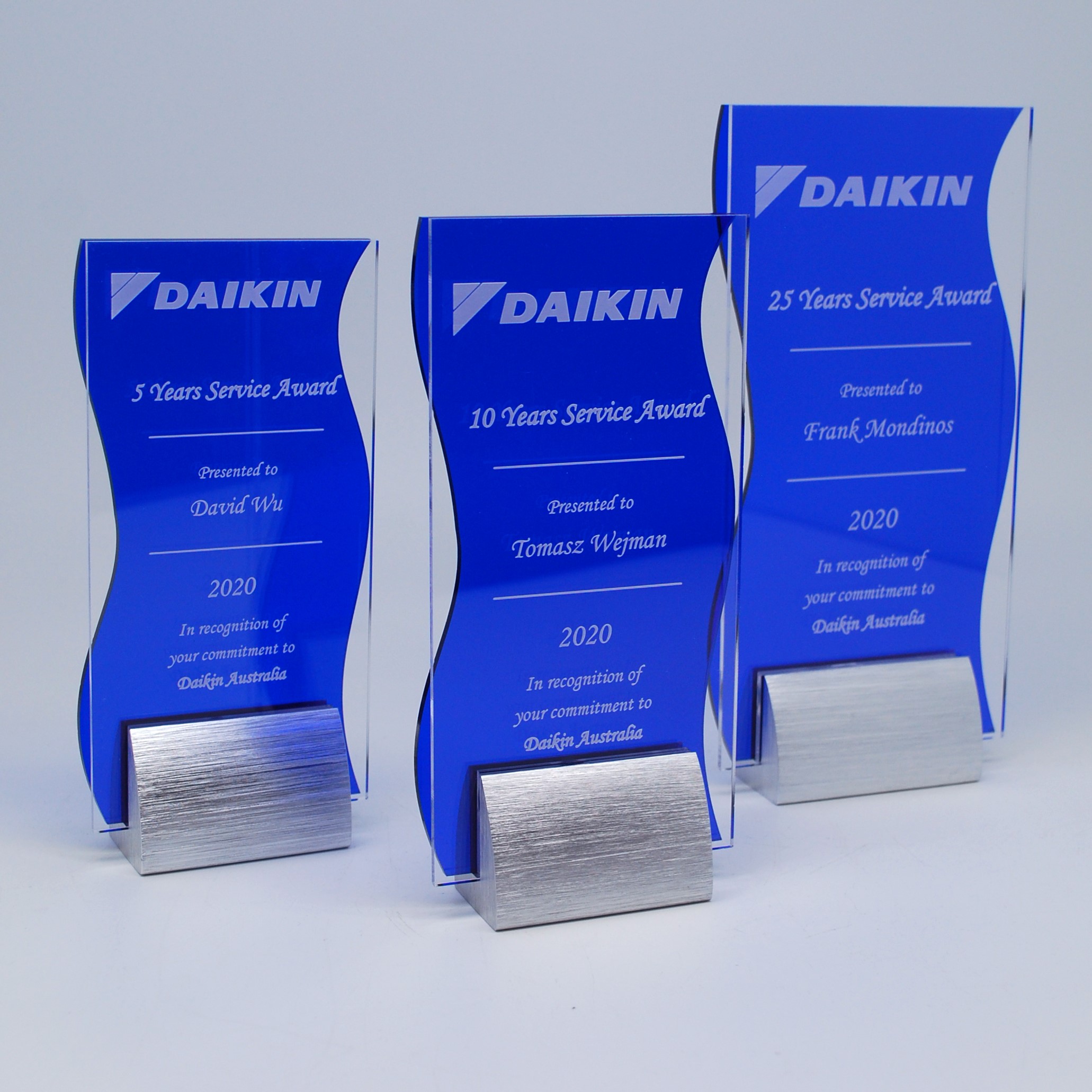 A striking blend of modern design and premium materials, this blue and clear acrylic wave trophy is set on a silver metal base for a refined finish. The flowing acrylic form creates a sense of movement, making it an ideal choice for those seeking contemporary acrylic awards.