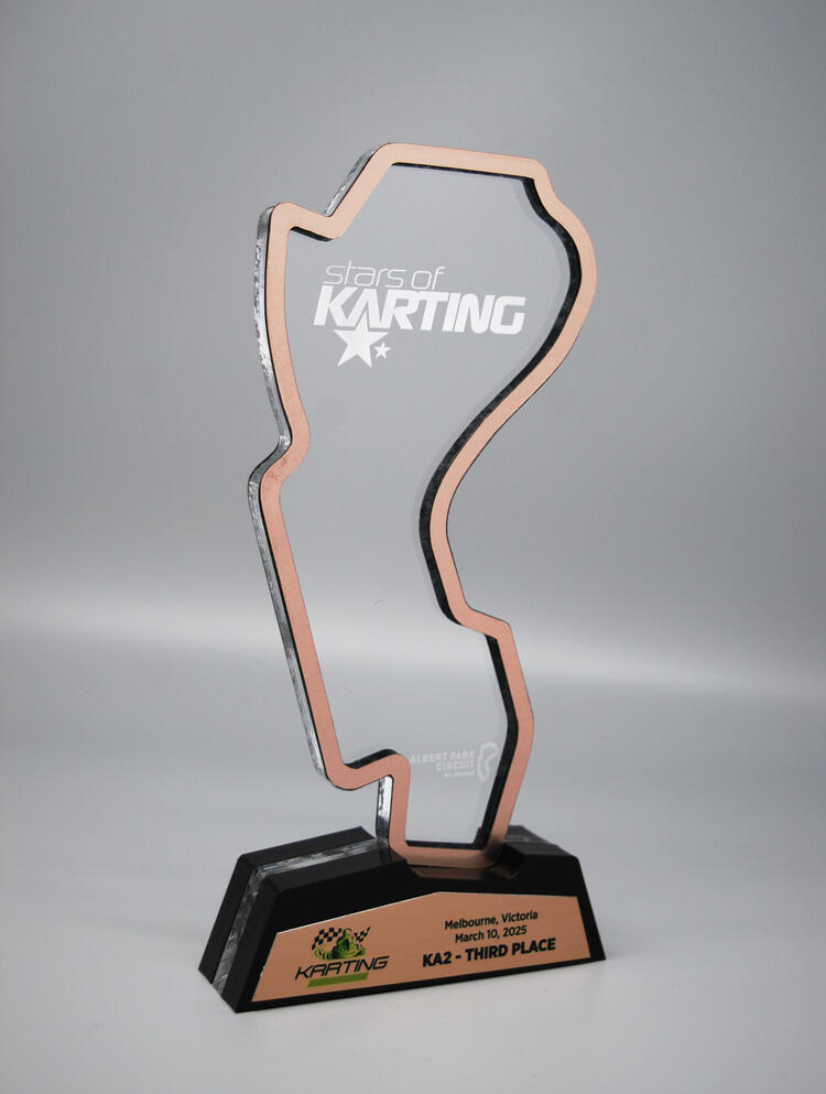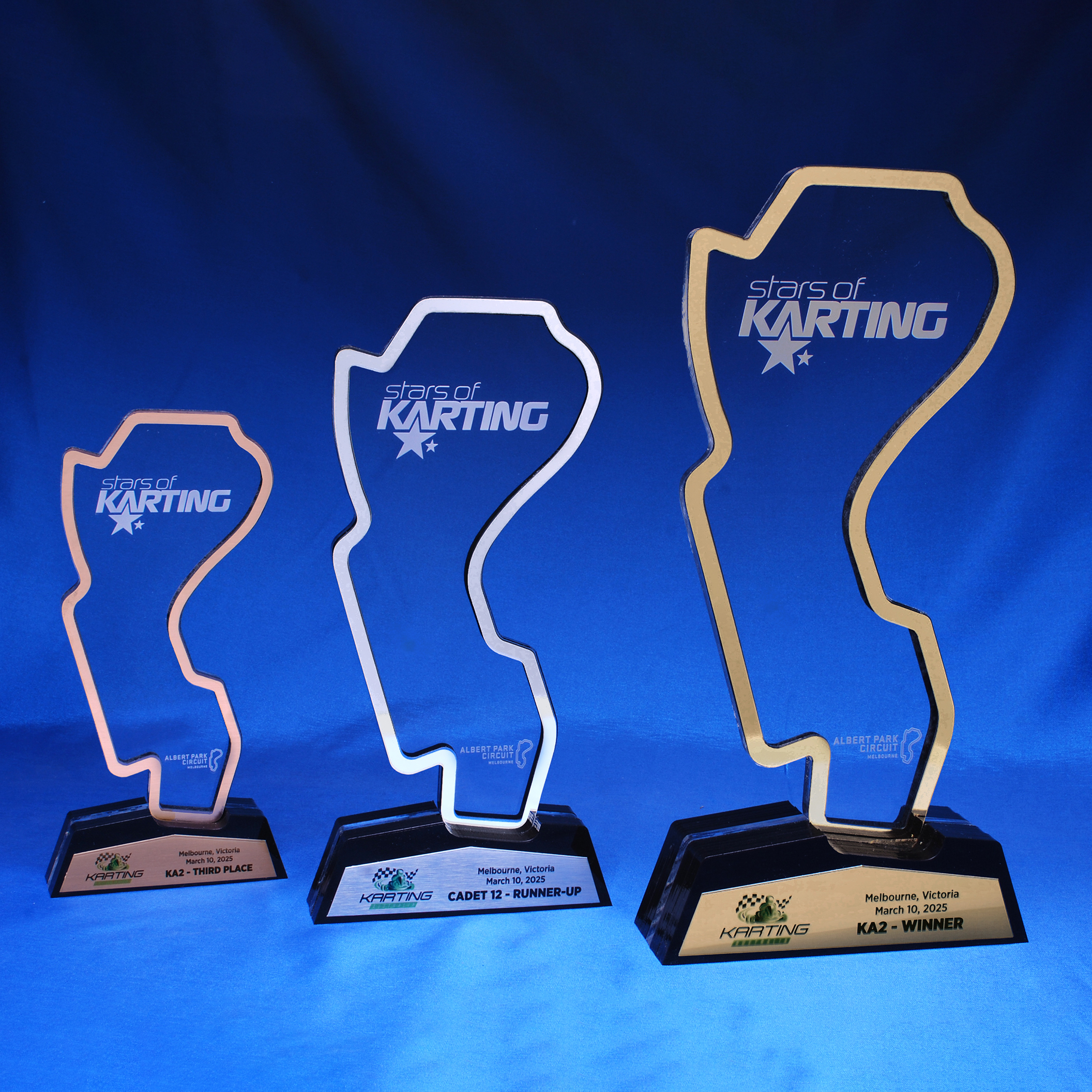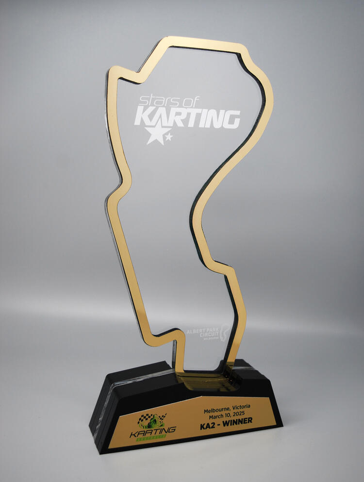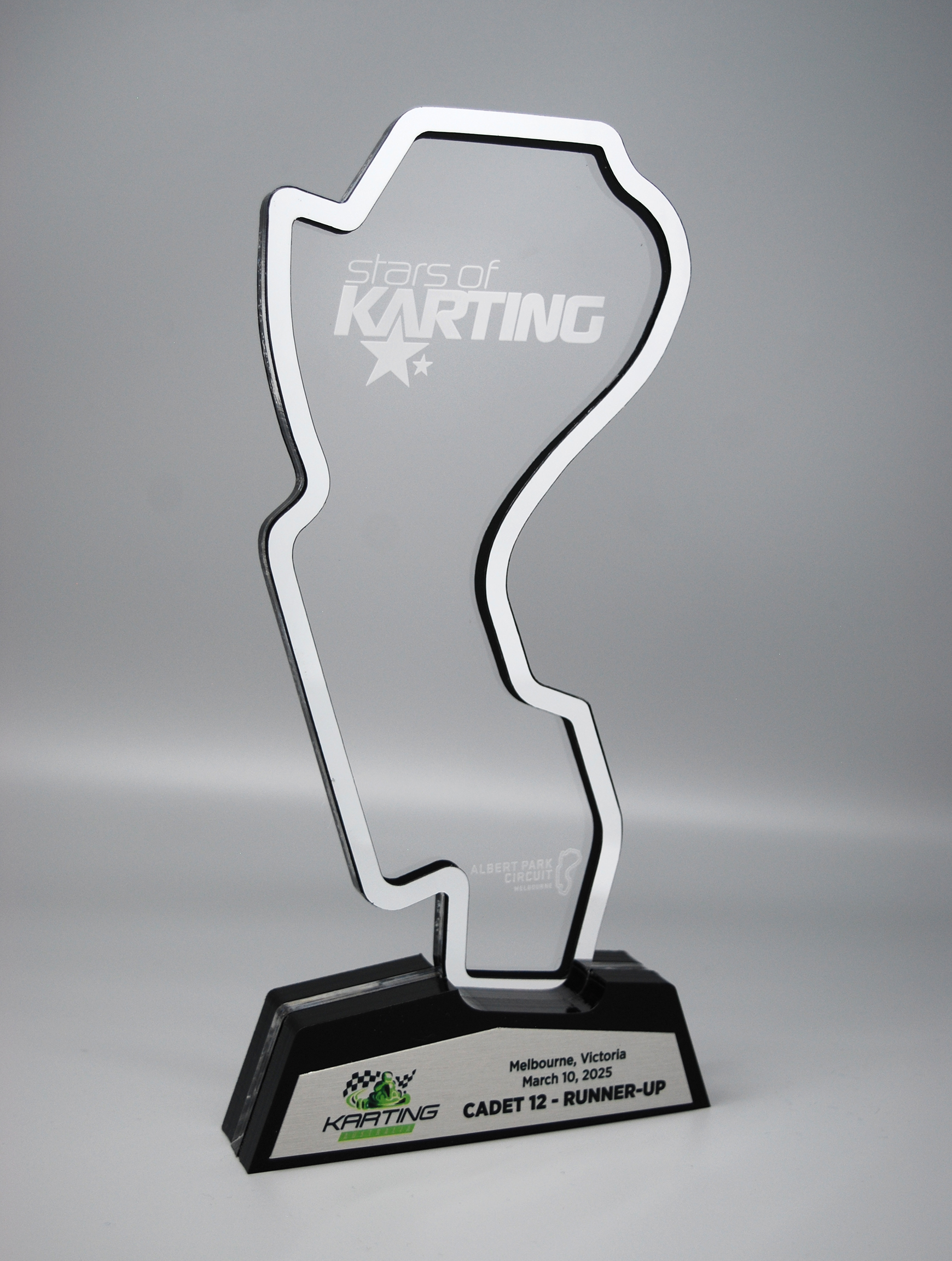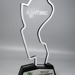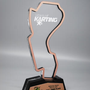 Crafted for standout recognition in motorsport events, this custom acrylic award features a distinctive race track silhouette. The award's sleek acrylic base ensures durability, while the metallic finish adds a sense of prestige. Ideal for motorsports trophies, it offers a contemporary and professional solution for celebrating achievement on the track.