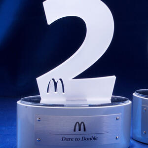 Custom Acrylic Hearts & Minds Layered Logo on Pillar Platform Base with Full Colour Print
