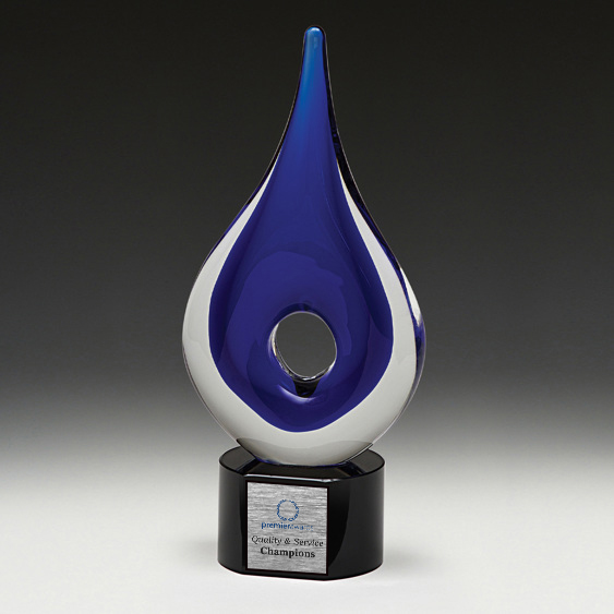 Art Glass Trophy - Vase Blue/Green On Black Base - With Printed Plate