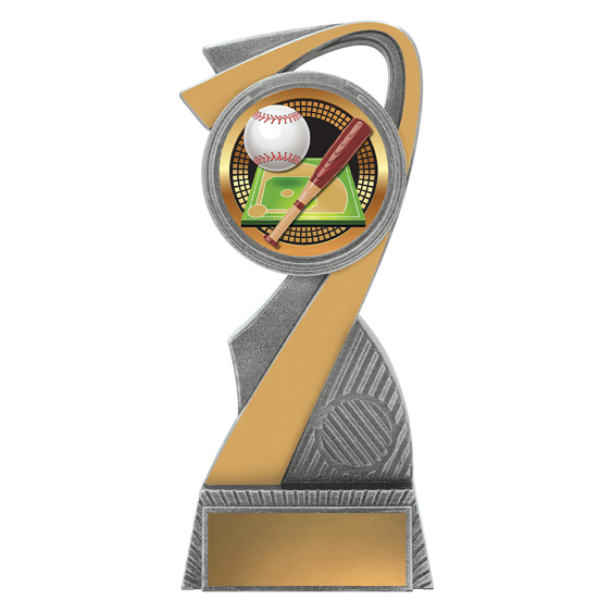 A dynamic resin trophy with curved lines and gold highlights, designed for baseball and softball awards. Features full colour insert showing a bat, ball, and field. The contemporary shape adds movement and style, making it suitable for any age group or level of play.