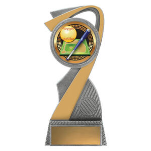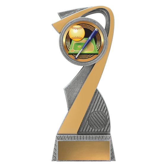 Contemporary resin softball trophy featuring full colour ball and bat insert over a dynamic gold and silver frame. The modern design and smooth curves give it a professional presentation for junior or senior teams. Includes engraving plate for names or event titles.