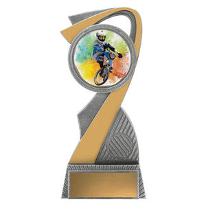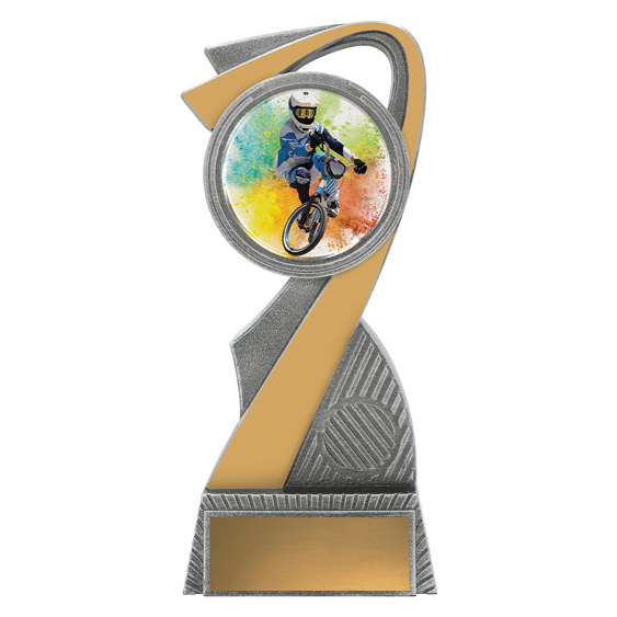 Antique silver resin BMX trophy with a sleek, textured wave design. Features a gold accented rider emblem for a contemporary edge. A standout choice for racing champions.