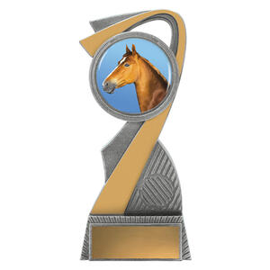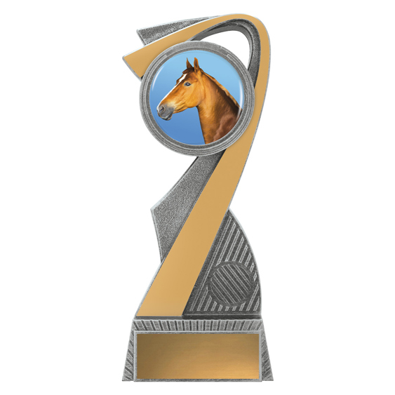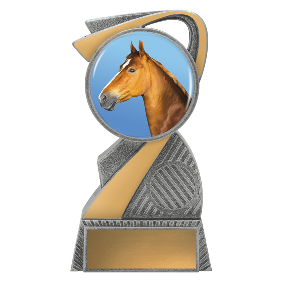 This contemporary horse trophy features a detailed horse head image displayed within a modern circular frame, highlighted with silver and gold resin accents. The sweeping angled design adds movement and style, making it a standout option for riding clubs, equestrian events, gymkhanas and achievement awards. Finished in metallic tones with a solid base for engraved wording, it offers a clean, modern look suitable for all ages and levels.