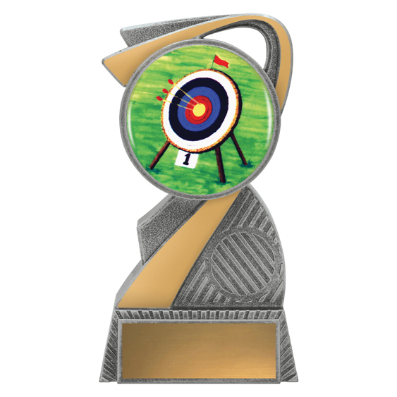 This archery trophy presents a sleek, modern spiral riser design with gold highlights and a full colour target insert. Perfect for clubs, schools and competitions, this dynamic trophy recognises precision and performance. Crafted from quality resin and finished with an engraving plate for names, results or event details.