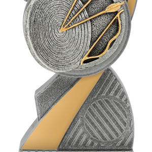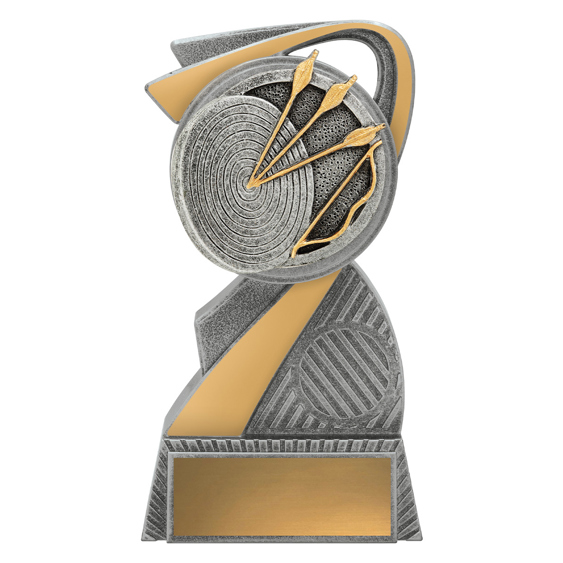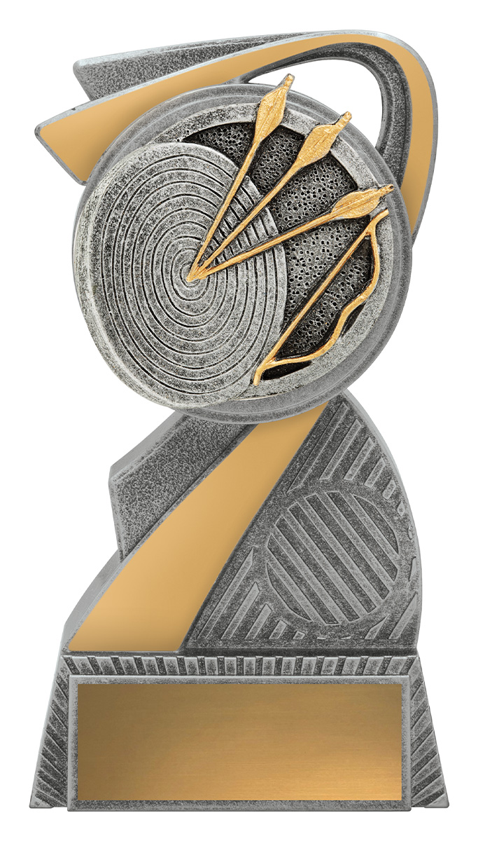 Featuring a bold circular target design with detailed arrows and a bow, this trophy combines classic styling with a sleek silver and gold finish. A great alternative design often used for archery or custom insert adaptations.