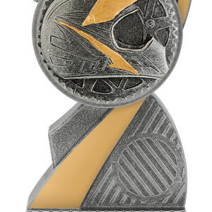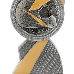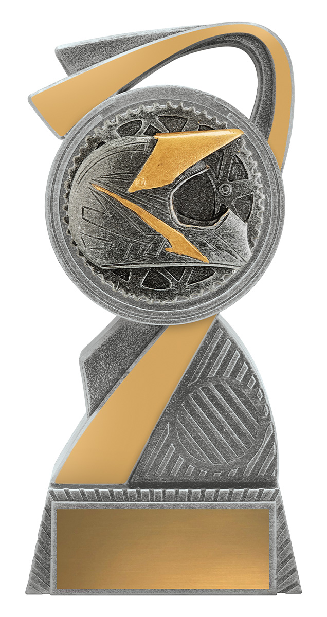 Celebrate motocross achievement with a trophy that blends bold design and precision craftsmanship. This motocross trophy features a striking helmet and gear motif in elegant silver and gold tones, set on a sculpted, abstract base. Crafted from durable resin, it offers a memorable and professional way to honour talent in motorsport.
