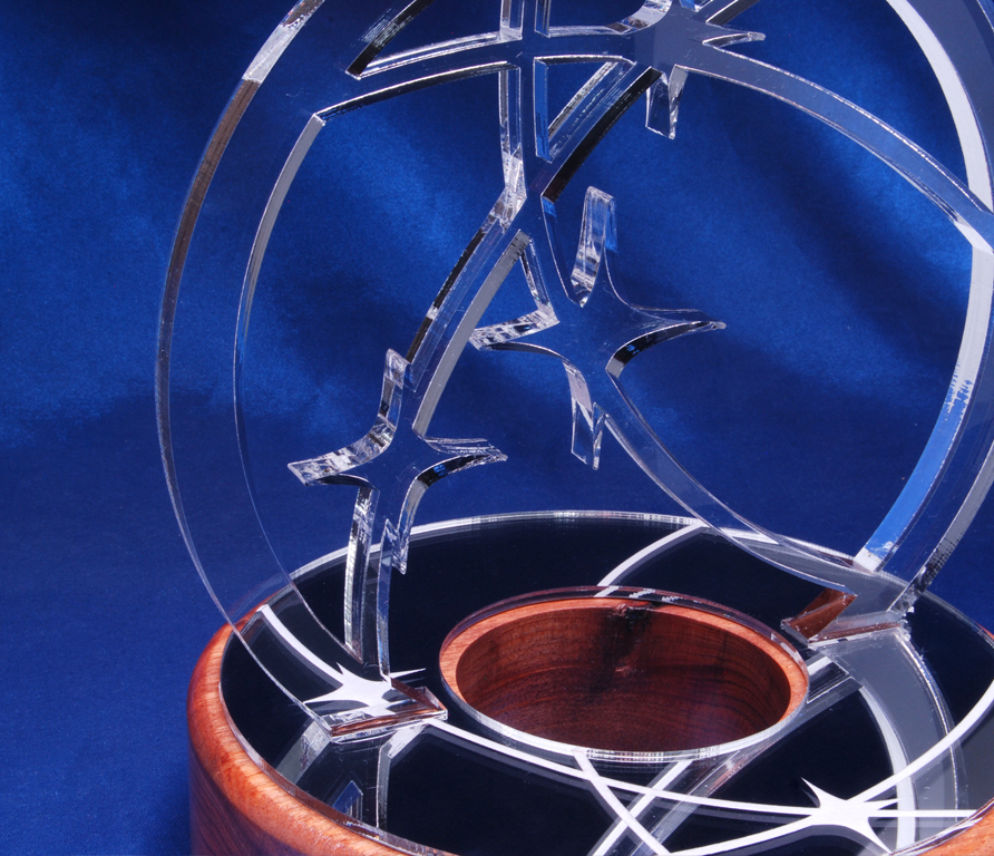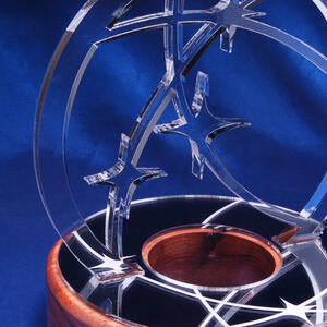A refined custom award combining precision cut clear acrylic and a handcrafted timber base. The acrylic top is intricately shaped to represent a logo design, creating a modern and lightweight alternative to metal.