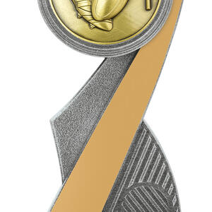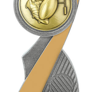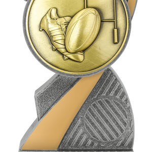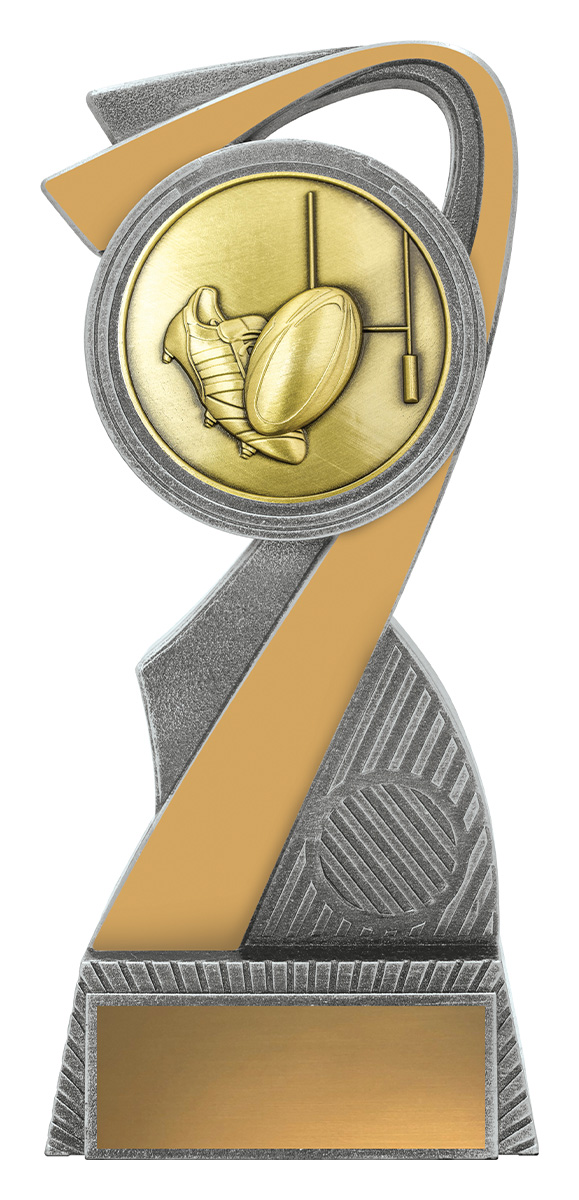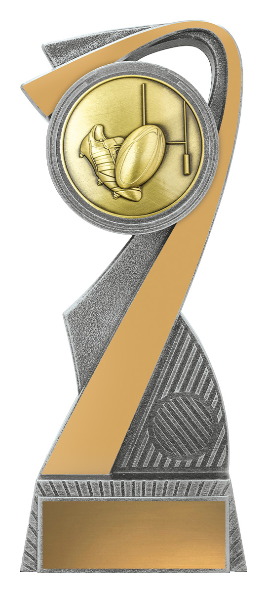 This rubgy trophy stands out with an abstract design that brings together a rugby ball, goalposts, and a shoe, reflecting the energy and spirit of the game. Finished in gold and silver, the resin construction ensures a balance of lasting quality and modern appeal. Its contemporary silhouette makes it a memorable choice for recognising rugby achievement.