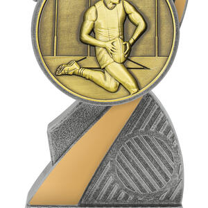 Celebrate achievement in Aussie rules football with a contemporary trophy that commands attention. This aussie rules trophy features a striking abstract, curved design in a gold/silver finish, highlighted by a detailed male figure holding a football. Crafted from premium resin, it stands on a decorative base, making it ideal for memorable recognition.