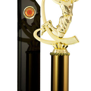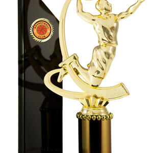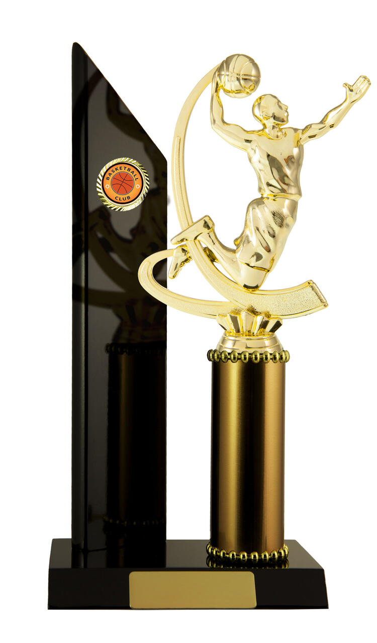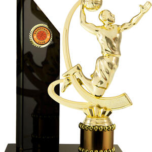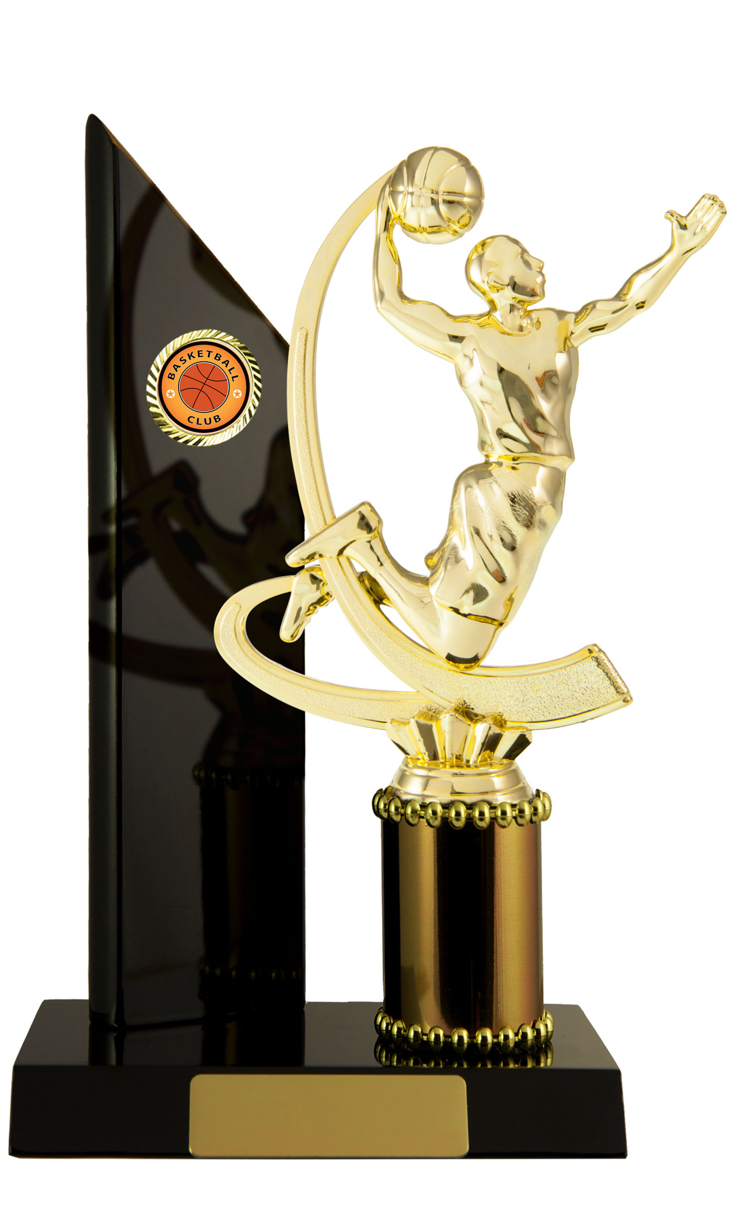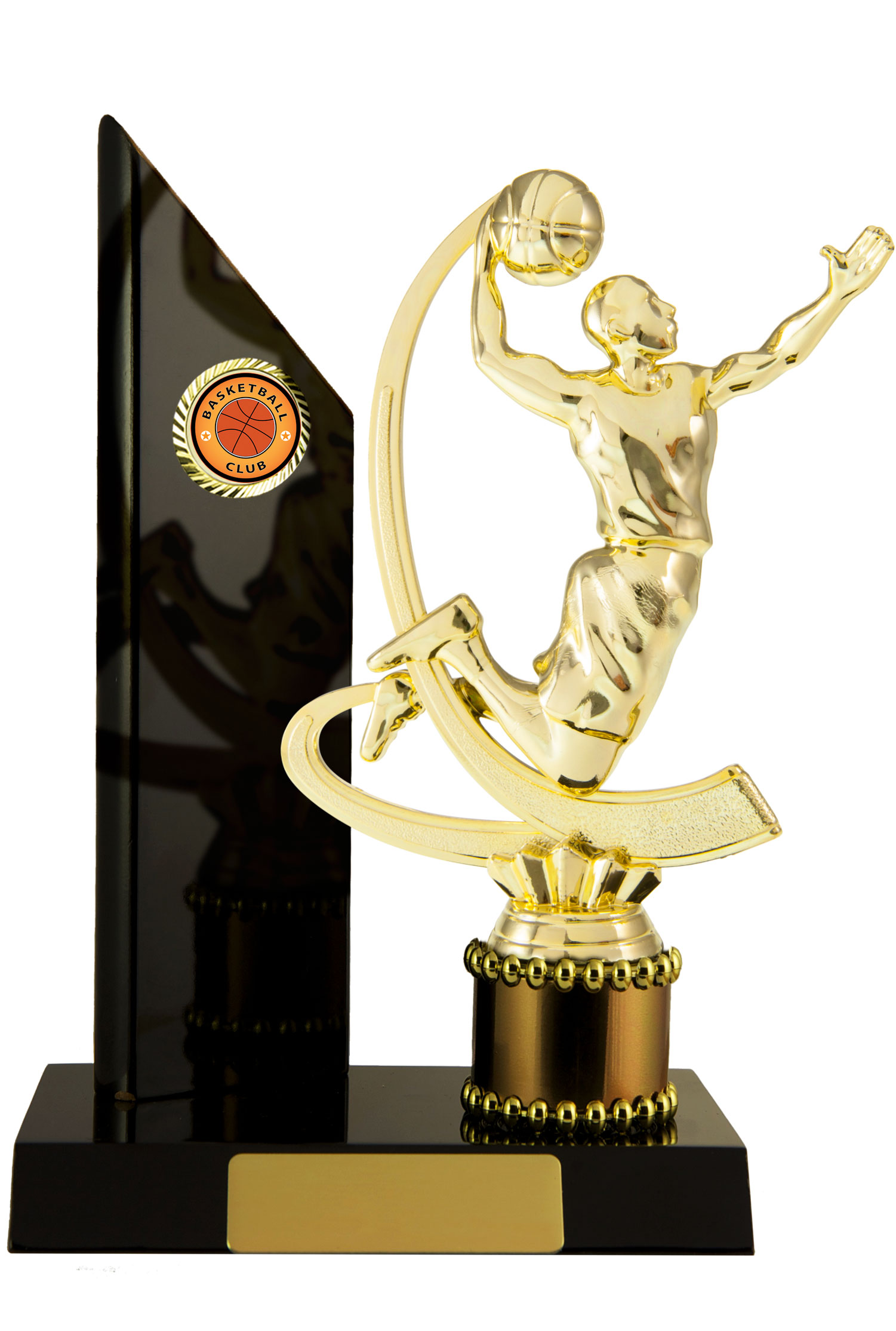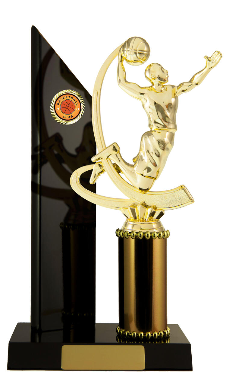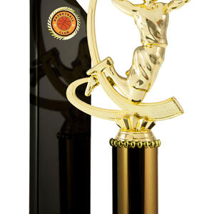 Crafted with precision, this basketball trophy celebrates athletic achievement with a gold and black finish. The design features a dynamic player in a dunking pose, set atop a sturdy rectangular base with a curved figure.