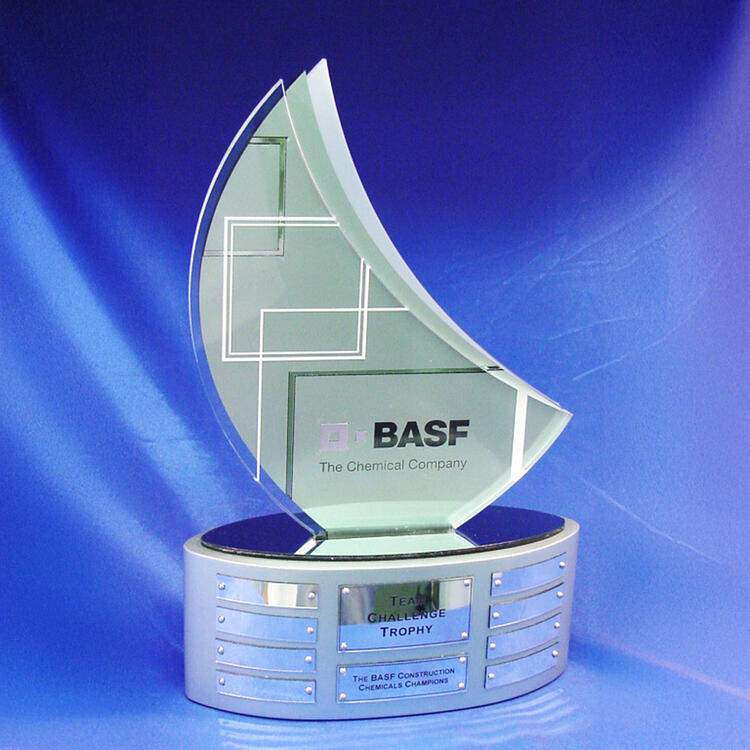 A contemporary lumina style award designed for BASF, featuring layered frosted and clear acrylic with laser etched detailing.
