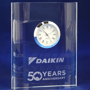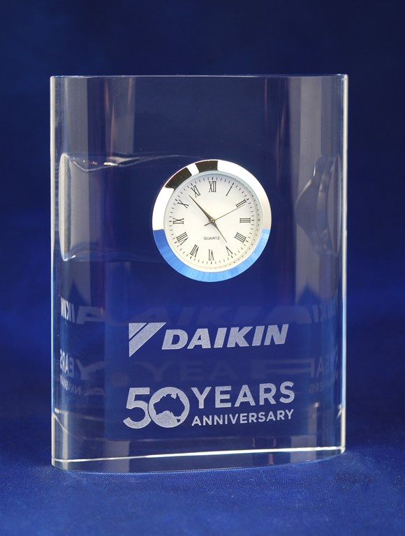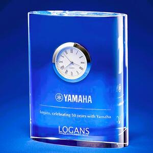 A refined curved crystal clock featuring a built-in timepiece and polished finish. Perfect as a lasting recognition piece for service or achievement, combining practical function with timeless elegance.