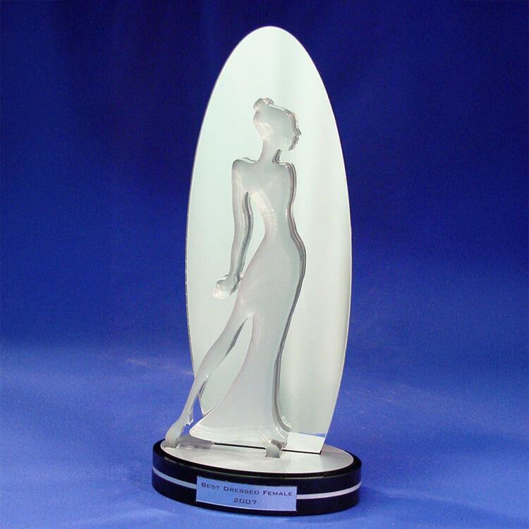 This stylish composition captures form and movement, offering a timeless design suited to fashion, achievement, or gala event awards. The frosted acrylic enhances the contrast and depth, all set on a polished custom base for a premium finish.
