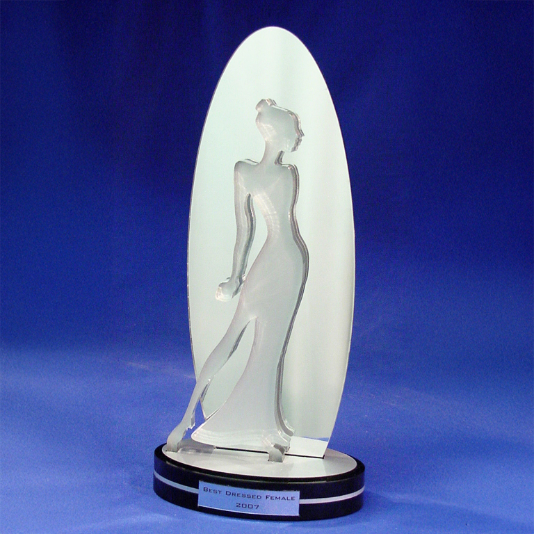 An elegant custom designed award featuring a precision cut female silhouette mounted against a frosted acrylic backdrop.