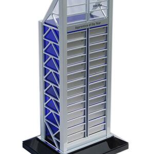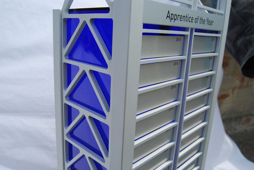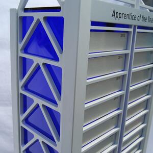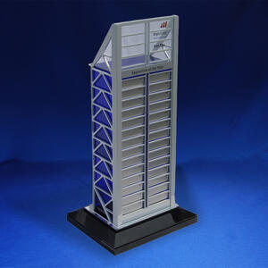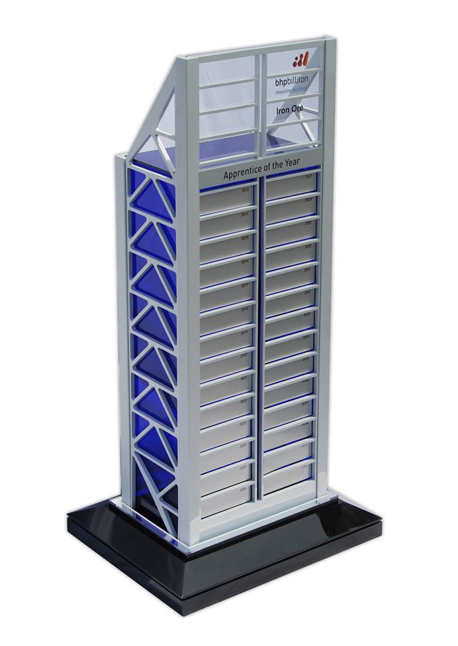 An impressive architectural replica, this custom perpetual trophy was designed to mirror the iconic BHP building in Perth. Crafted for BHP Billiton Iron Ore, it stands approximately 500mm tall and is built from satin-anodised laser-cut alloy with a translucent blue acrylic centre, symbolising strength and innovation. The structure rests on a polished black base and features perpetual plates for annual award recognition. A striking example of engineering precision and custom craftsmanship, proudly created for one of Australia's leading companies.