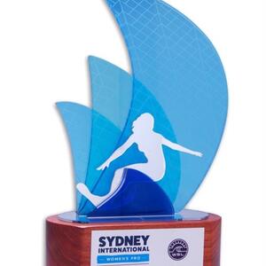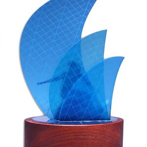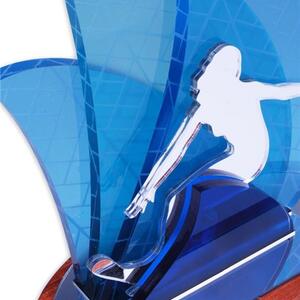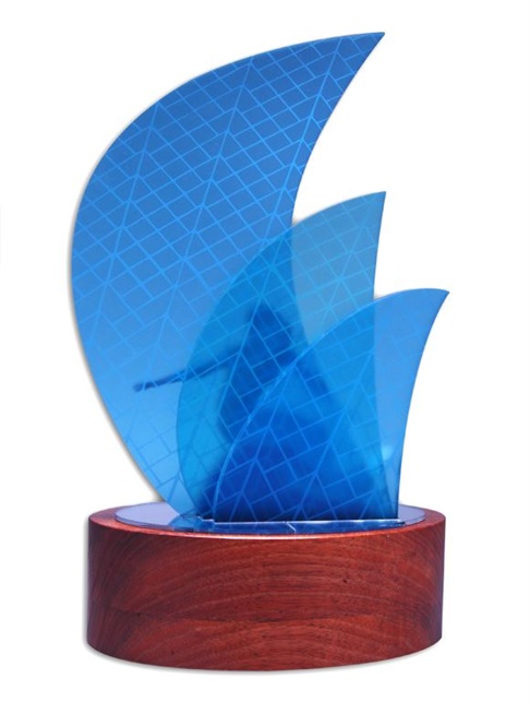 Crafted with precision, the overlapping translucent blue acrylic sails create depth and vibrancy, complemented by a silhouette cut figure and mounted on a rich timber base with a front plate for event or recipient details.