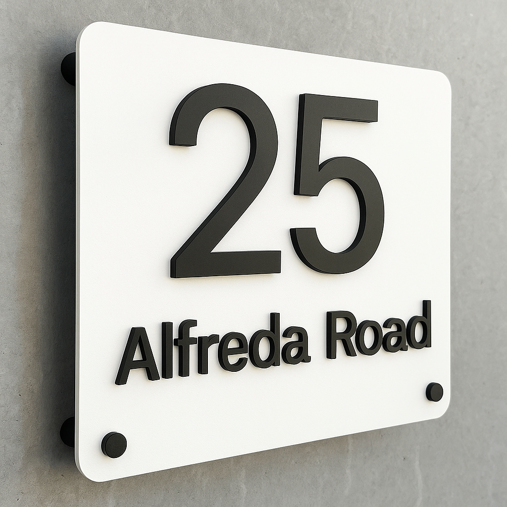 Make your address stand out with our Acrylic Building and House Name Signs featuring precision-cut raised lettering. These modern signs are crafted from premium acrylic and mounted with sleek standoff fixings for a dimensional, floating effect that adds depth and visual appeal to any facade.