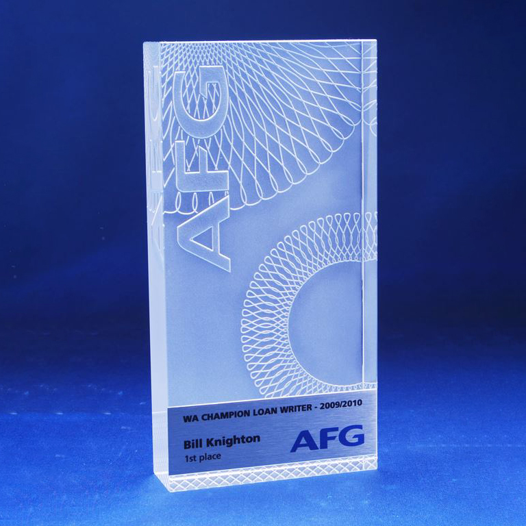 We use Superior Sandblast engraving or high-resolution full-colour printing to achieve striking results on our glass awards and trophies.
