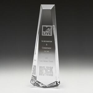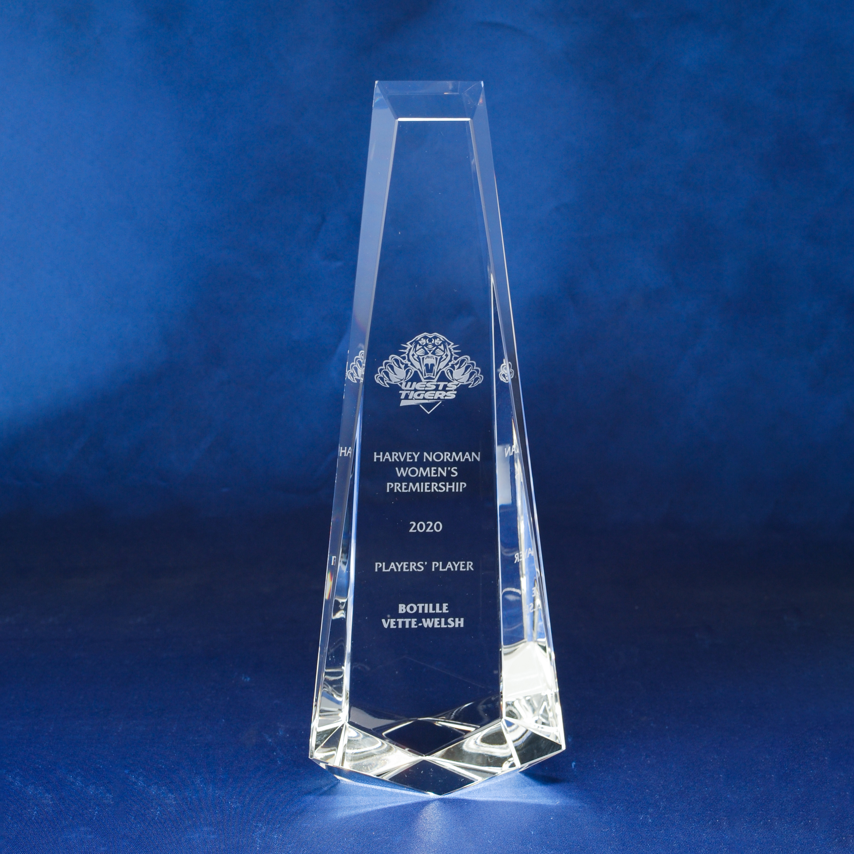 This crystal trophy features a clear, tapered rectangular prism design that stands out for its modern clarity and sophistication. Crafted from premium crystal, its sleek lines and balanced form make it an elegant choice for recognising excellence across corporate, academic, or sporting achievements. Its surface is ideal for precision engraved text and logos, creating a memorable and personalised award.