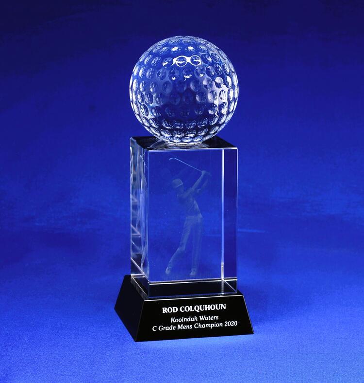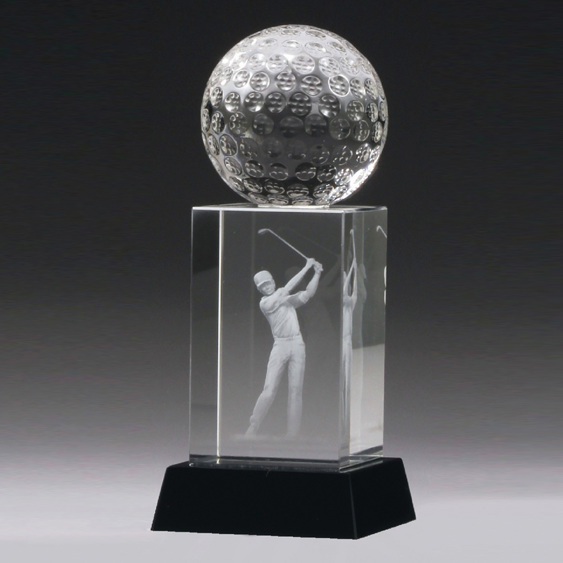 A distinctive crystal golf award featuring a golfer figure and ball detail that are part of the internal design. Crafted with precision and clarity, itÂ’s the perfect way to recognise golfing success or club milestones.