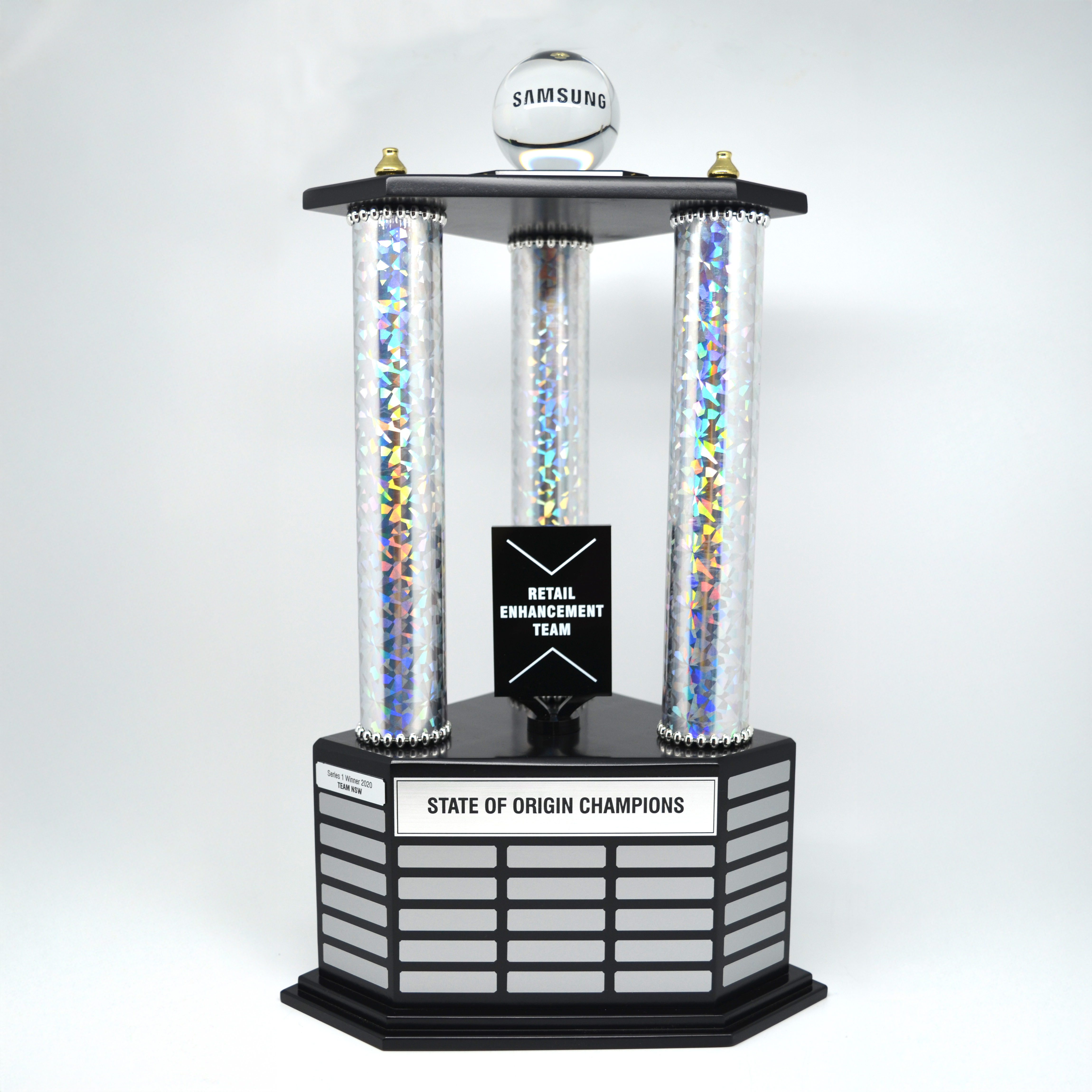 A grand custom perpetual trophy designed for ongoing recognition. This statement piece features a solid timber base with multiple name plates, holographic columns, and a crystal sphere top element for a striking finish.