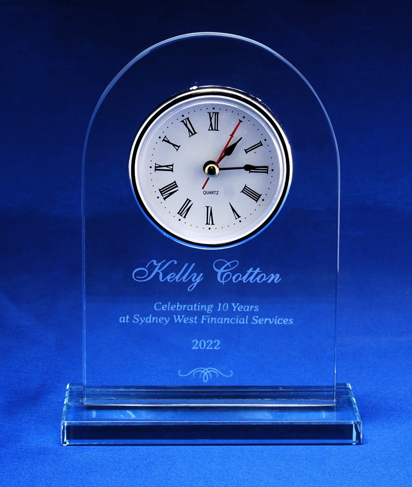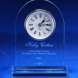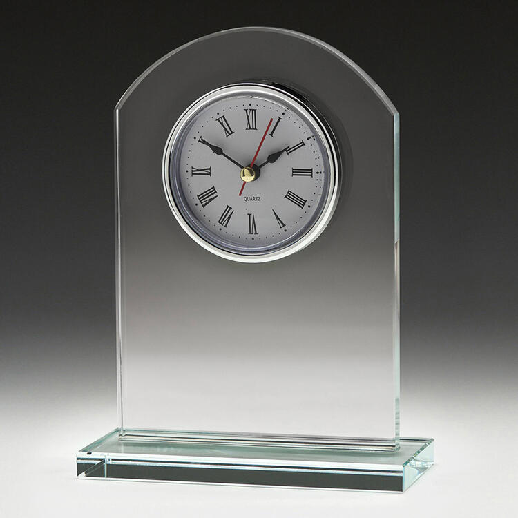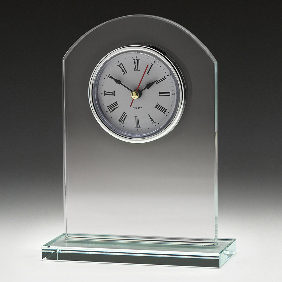 Crystal clear glass clock with a modern arched top and classic quartz movement. The minimalist design offers ample engraving space for messages or logos, ideal for achievement awards or service recognition.