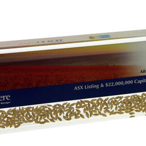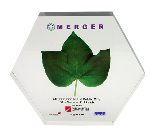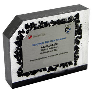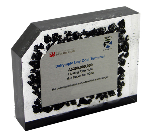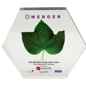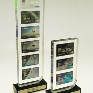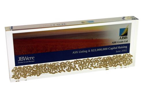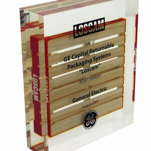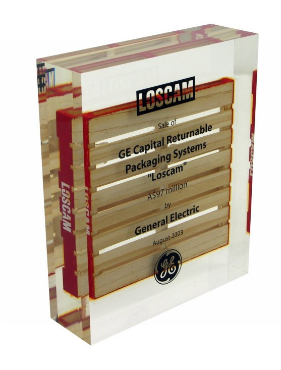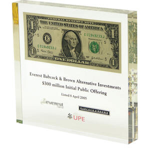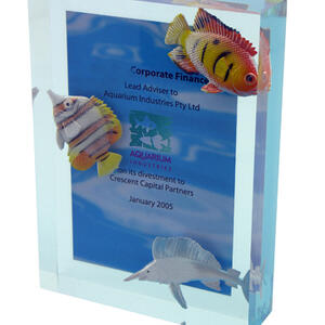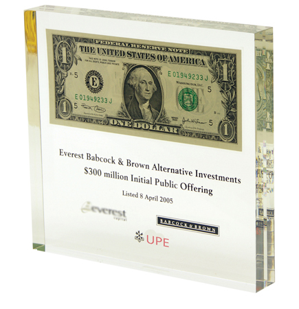An evolution of the classic embedment style. Add a three-dimensional themed object within the acrylic to create a dynamic focal point. Supply your own item, or have us design and produce it for you —a neat, sophisticated way to commemorate a momentous transaction. Almost anything can be embedded into acrylic resin financial tombstones.