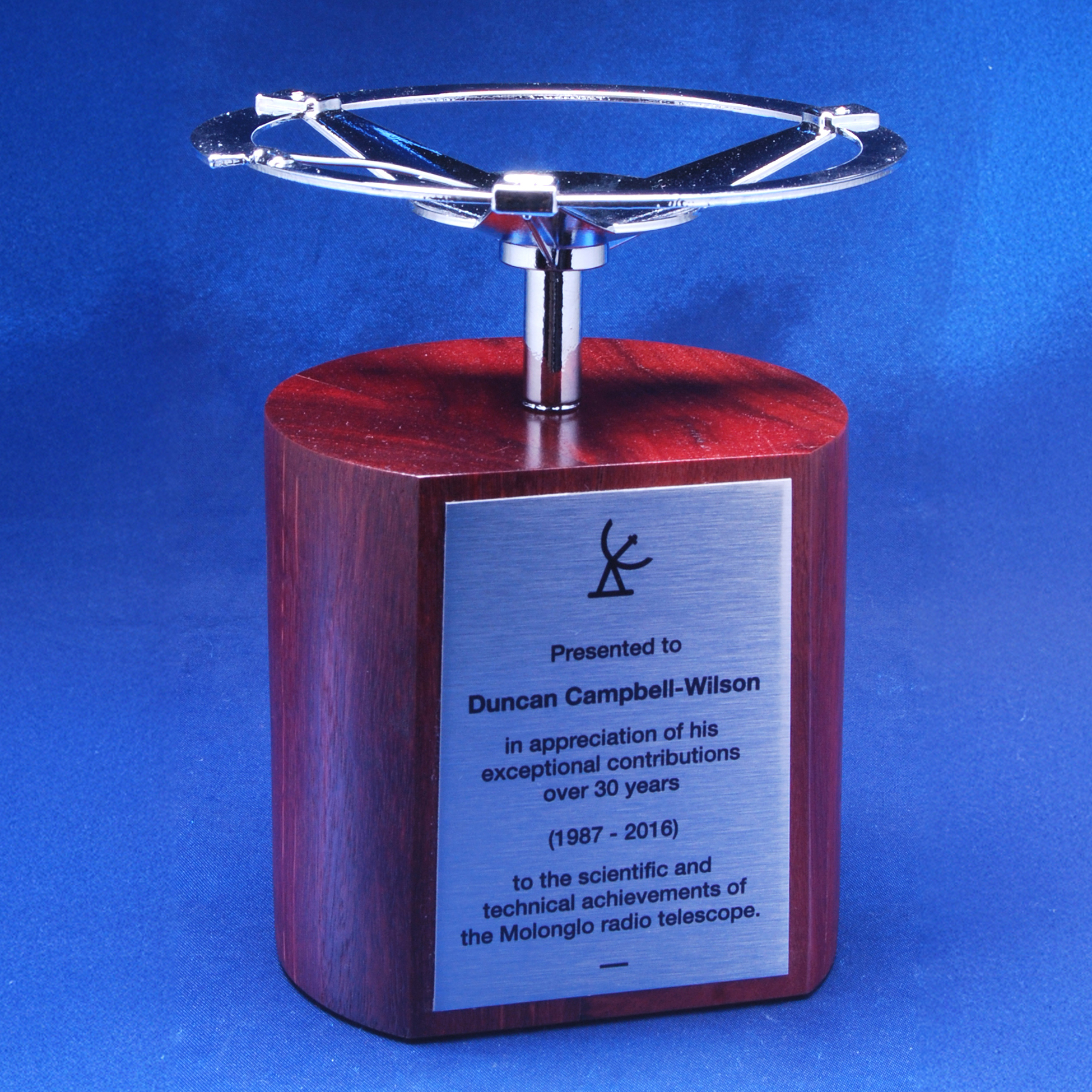 This custom award features a precision engineered metal component mounted on a polished timber base, combining warmth and sophistication.