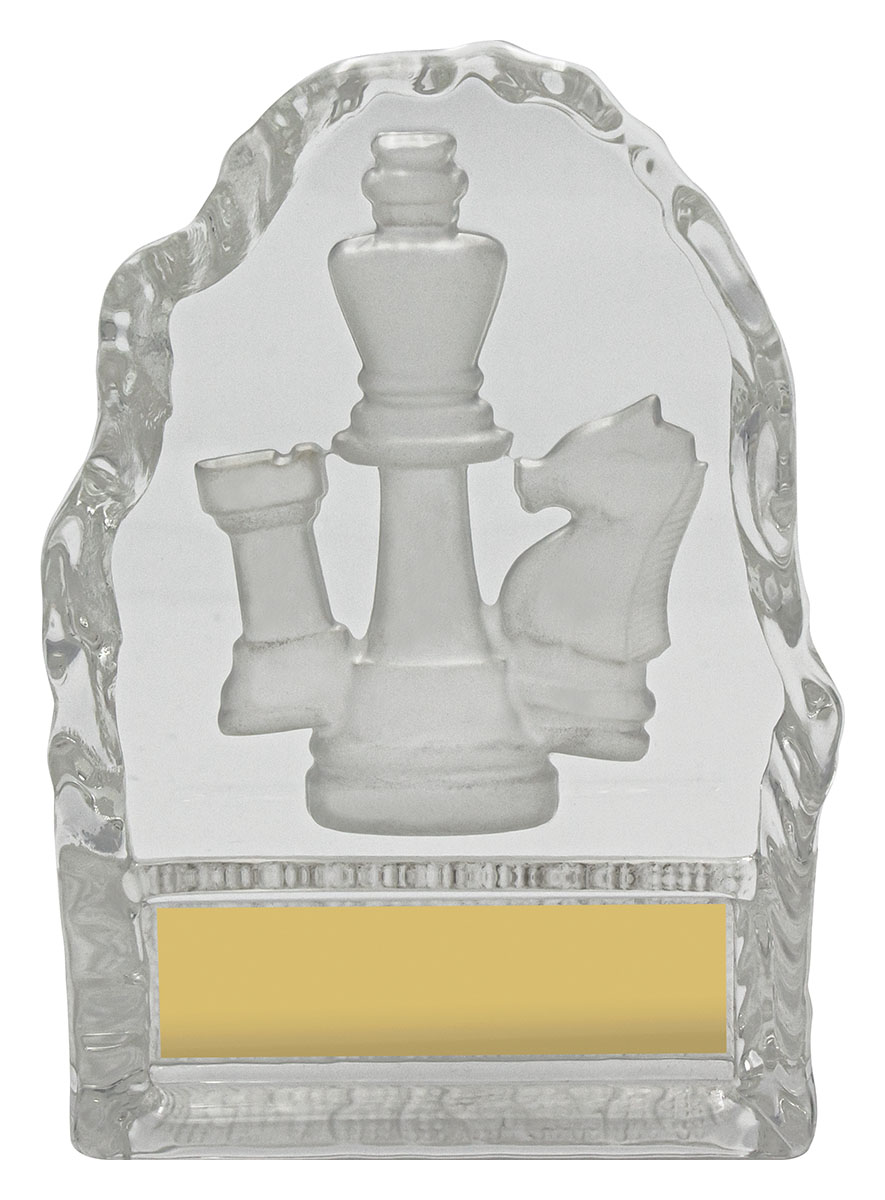 This chess trophy crystal captures the essence of strategy and achievement, crafted in clear glass. Sculpted rectangular with jagged edges to evoke the feel of an iceberg, it features detailed representations of the king, rook, and knight. An elegant choice for recognising outstanding performance in chess, it brings a sense of distinction to any event.