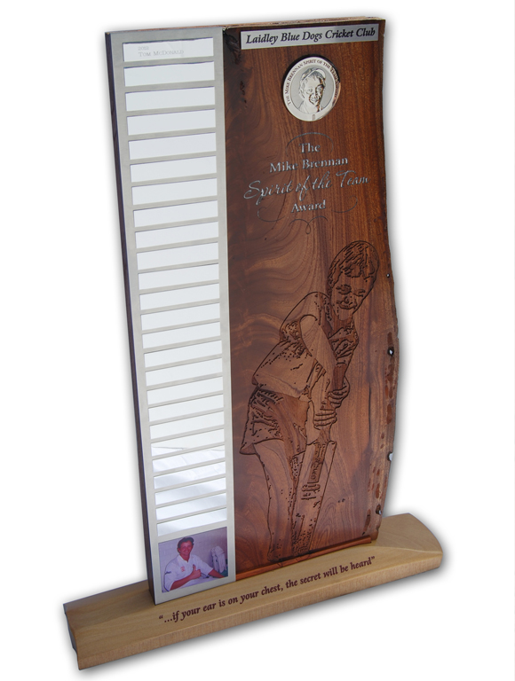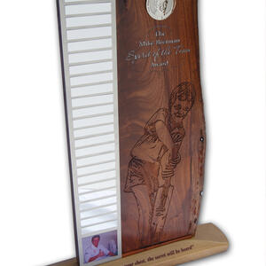 A beautifully crafted perpetual award featuring a rich timber panel enhanced with sandblasted artwork and engraved text.