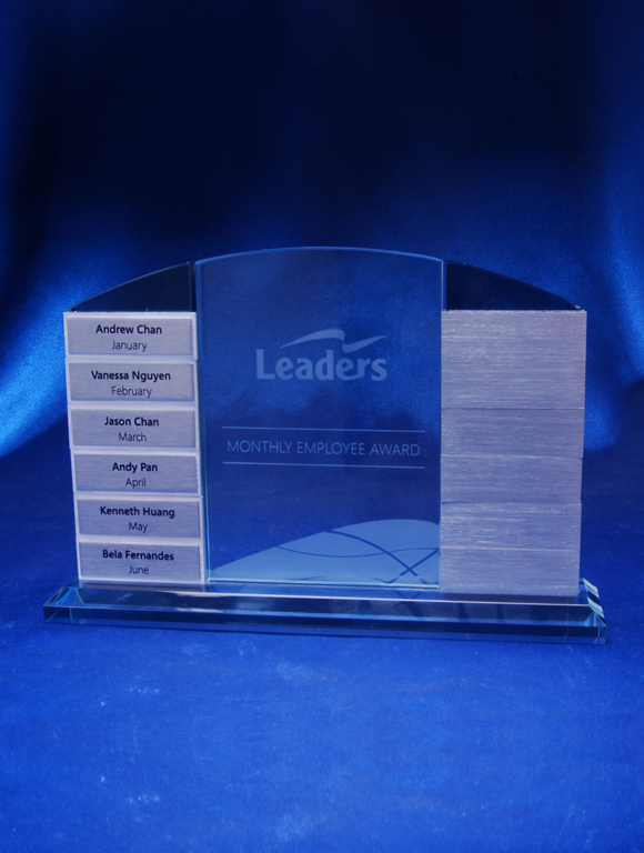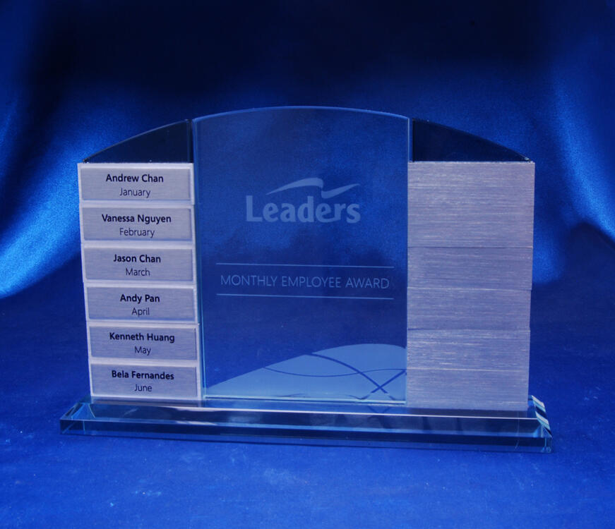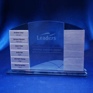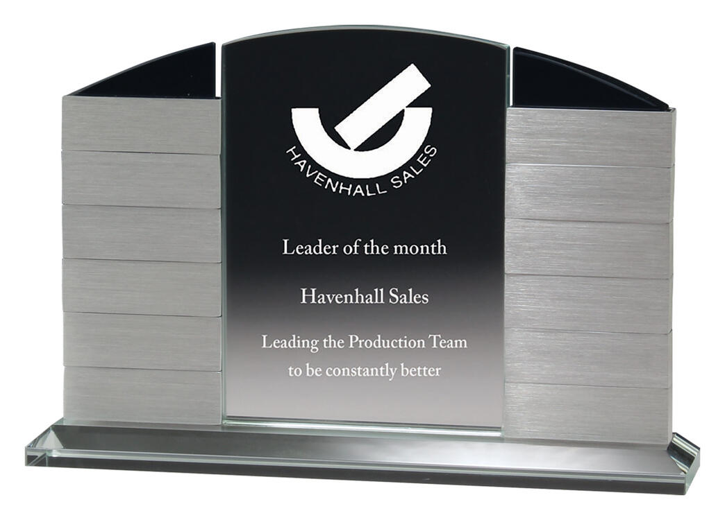This elegant perpetual award is crafted from premium glass with a brushed metal side panel featuring removable plates, perfect for updating with winners' details each year. The glass front is sandblasted with your custom design or logo, making it an ideal recognition piece for ongoing achievements. Stylish and versatile, it offers a lasting way to celebrate excellence over time.