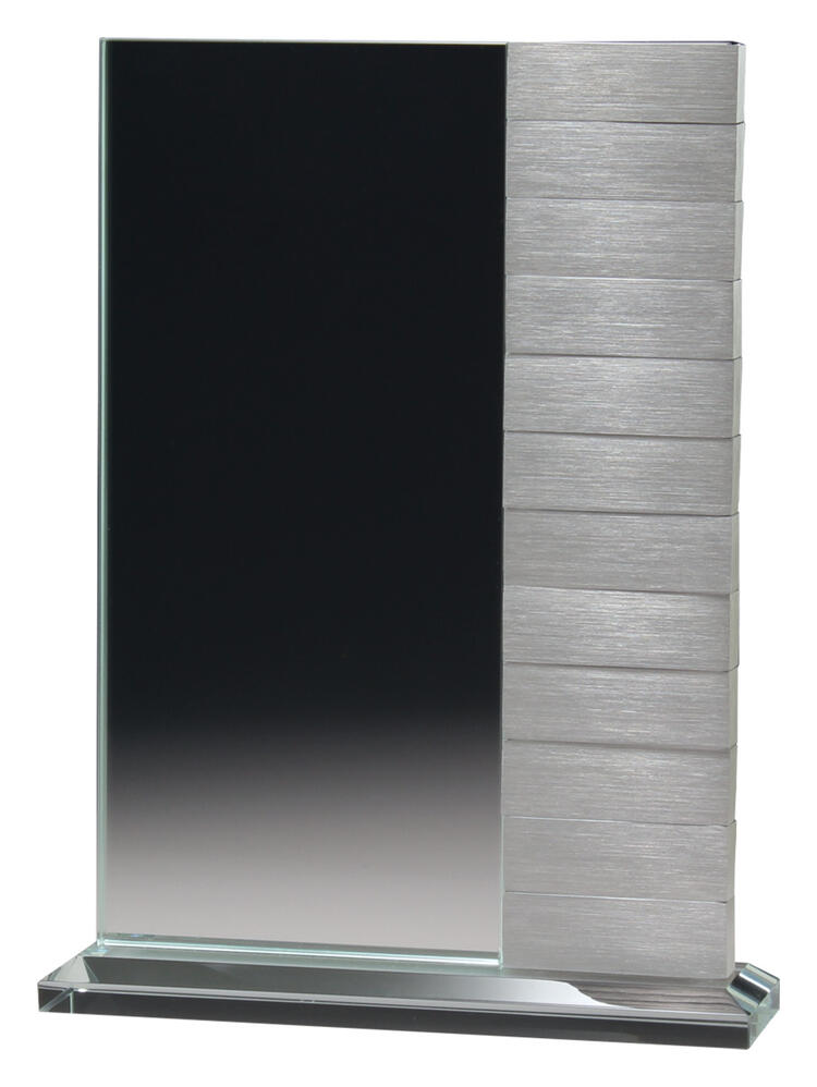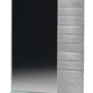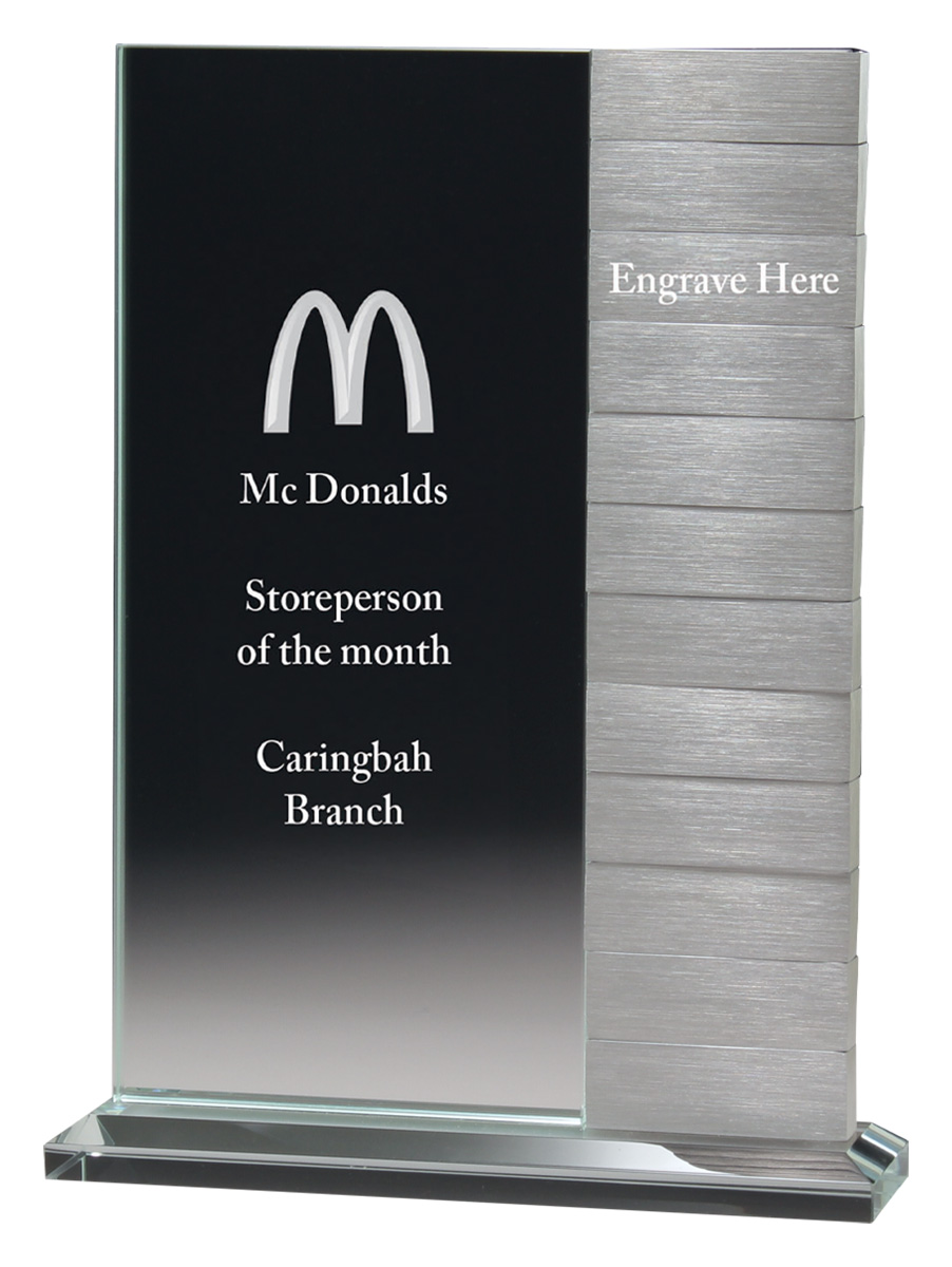 This elegant perpetual award is crafted from premium glass with a brushed metal side panel featuring removable plates, perfect for updating with winners' details each year. The glass front is sandblasted with your custom design or logo, making it an ideal recognition piece for ongoing achievements. Stylish and versatile, it offers a lasting way to celebrate excellence over time.