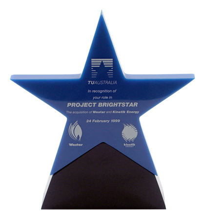 A striking resin star award featuring a two tone finish in matte black and vibrant blue. The bold star silhouette offers excellent presence, while the smooth front surface allows for crisp, detailed printing.