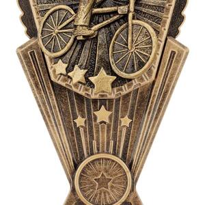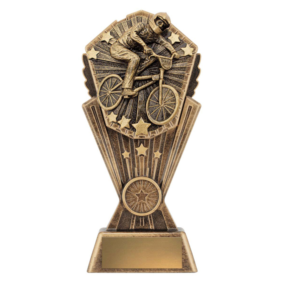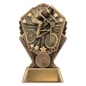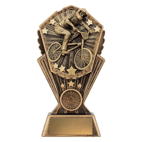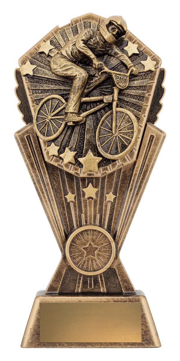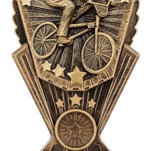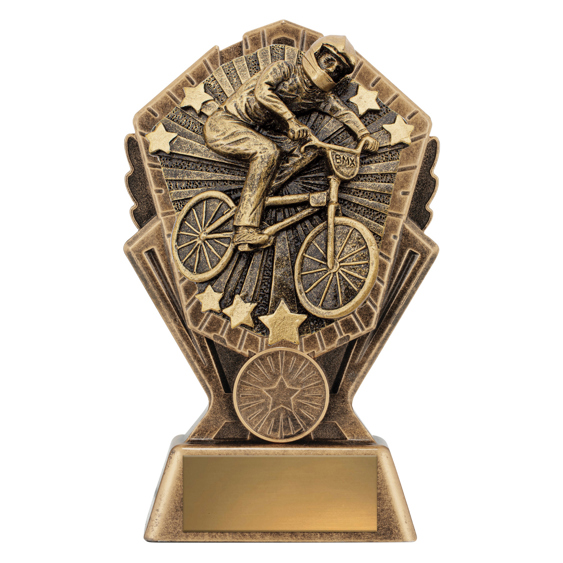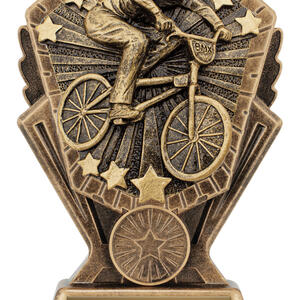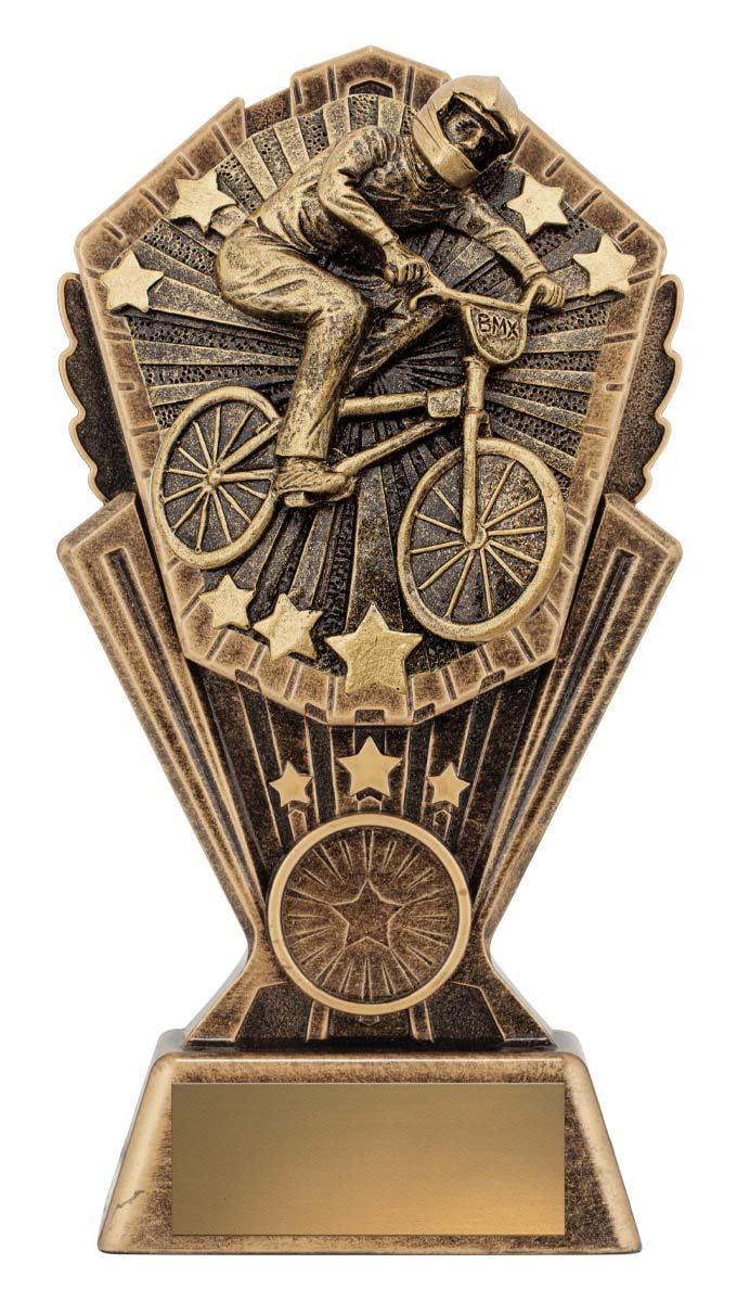 Antique bronze resin BMX trophy featuring a raised biker design with a starburst background. Sturdy and timeless, this is a popular choice for racing clubs and event winners.