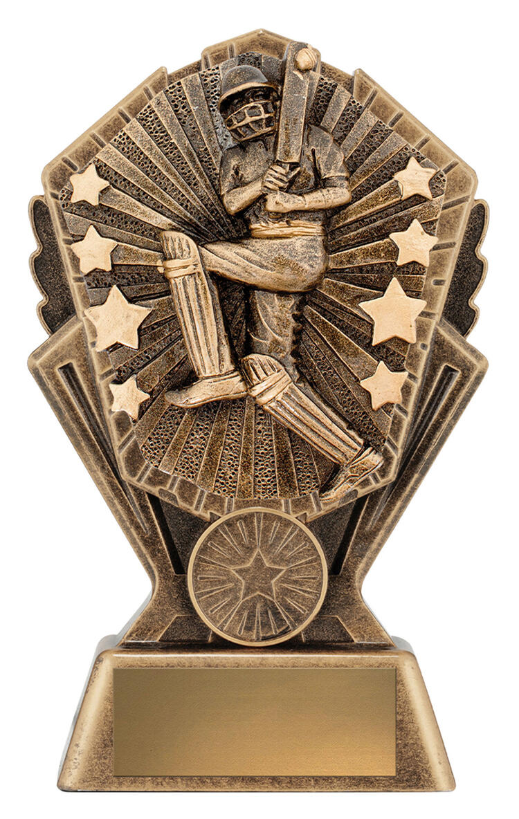 Celebrate outstanding cricket achievement with this expertly crafted award. Showcasing a male player in a dynamic batting stance beside bat and stumps, it is finished in elegant gold with striking star motifs. Designed for those seeking reliable and memorable cricket trophies, its durable construction and decorative form honour every hard earned victory.