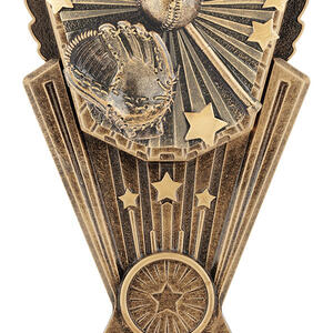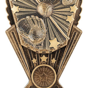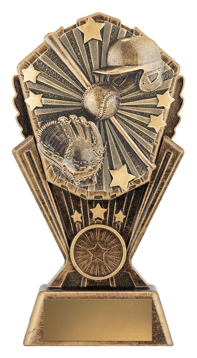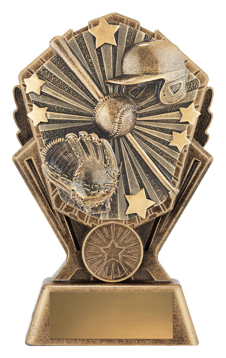 This baseball trophy features a striking fan shaped top in gold, crafted with attention to both form and detail. The design showcases a baseball, glove, bat, and helmet, all accented by star motifs that lend a sense of occasion. Durable resin material and elegant finishes create a memorable recognition piece for celebrating achievement in baseball.