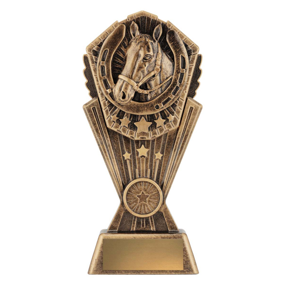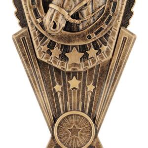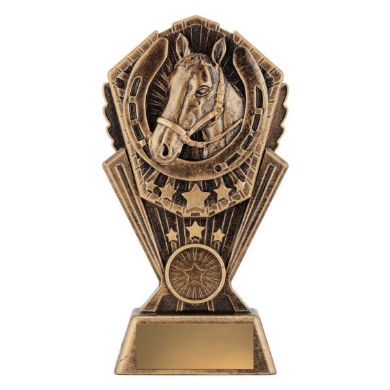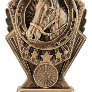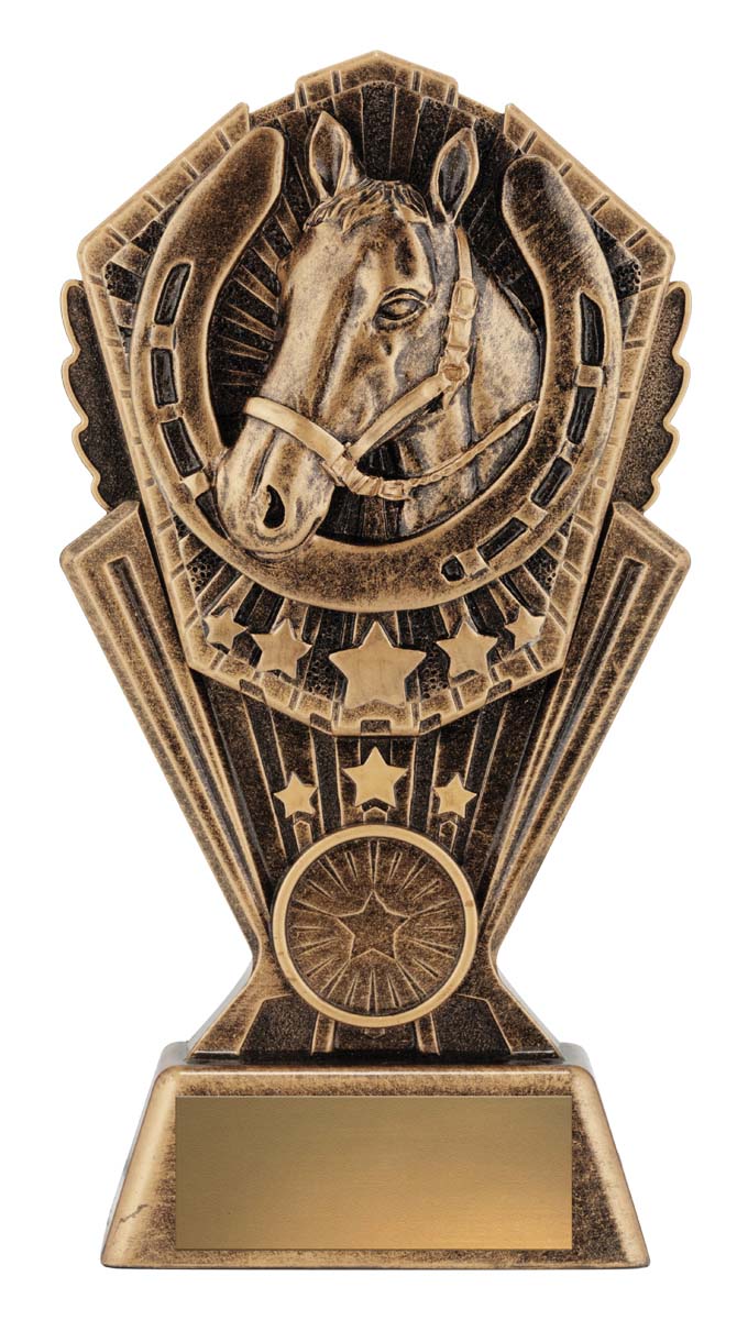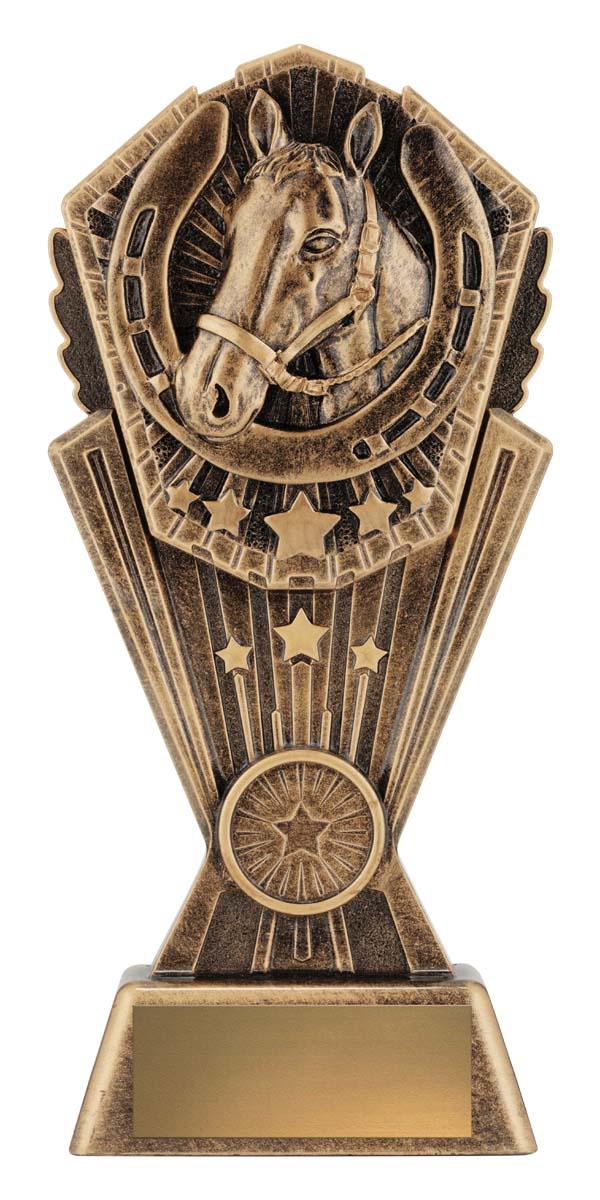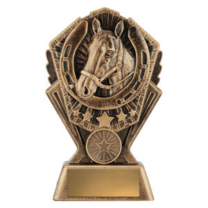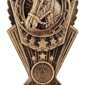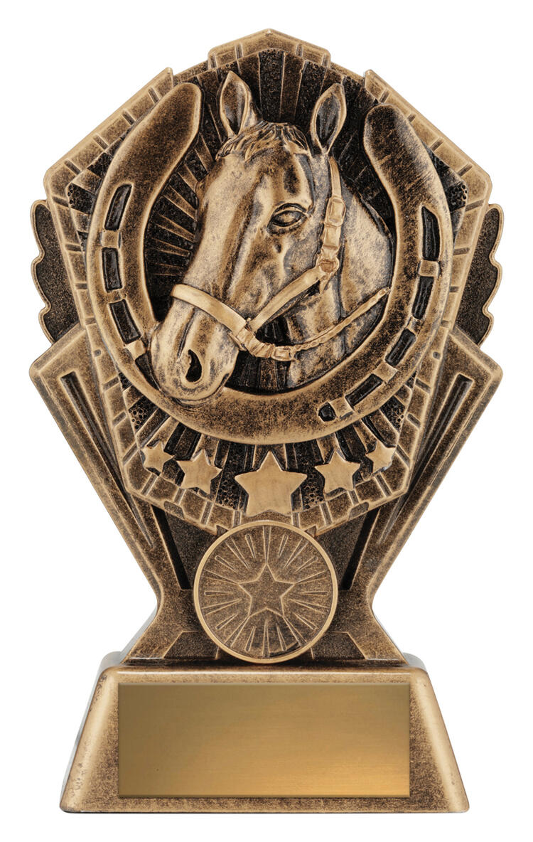 This award combines the classic symbols of horsemanship: a detailed sculpted horse head surrounded by a bold horseshoe and star details. Cast in antique gold resin with rich texture, it suits champion awards, stable competitions, best presented horse, encouragement awards and more.