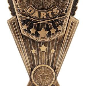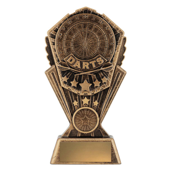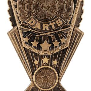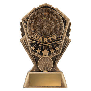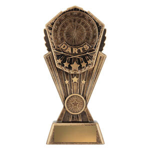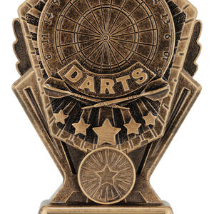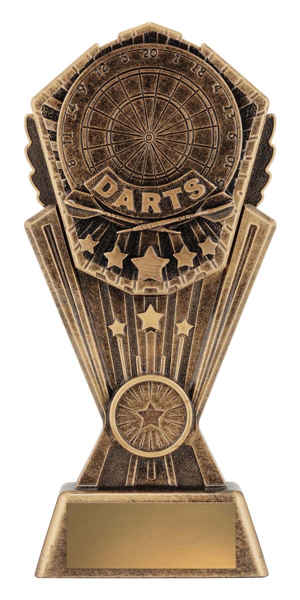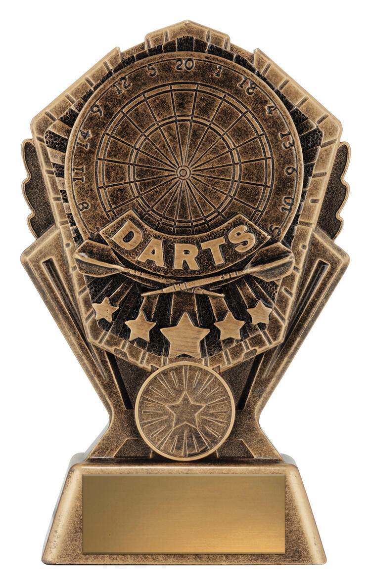 This resin darts trophy features the word DARTS with a dartboard background and star accents. Finished in antique gold tones, its ideal for league winners and tournament champions.