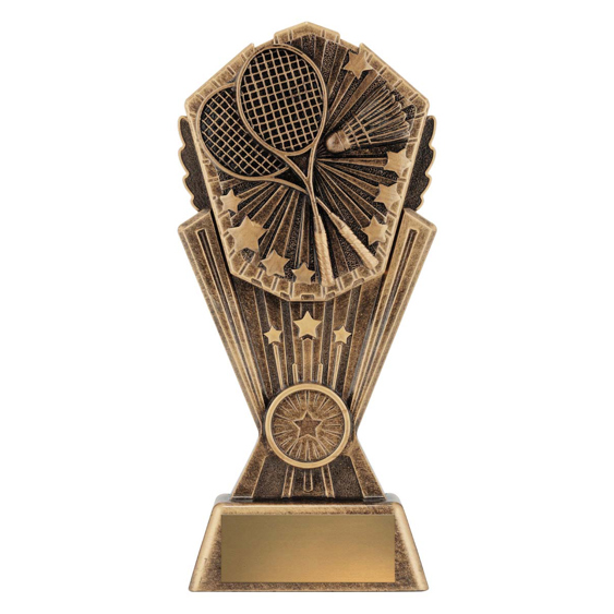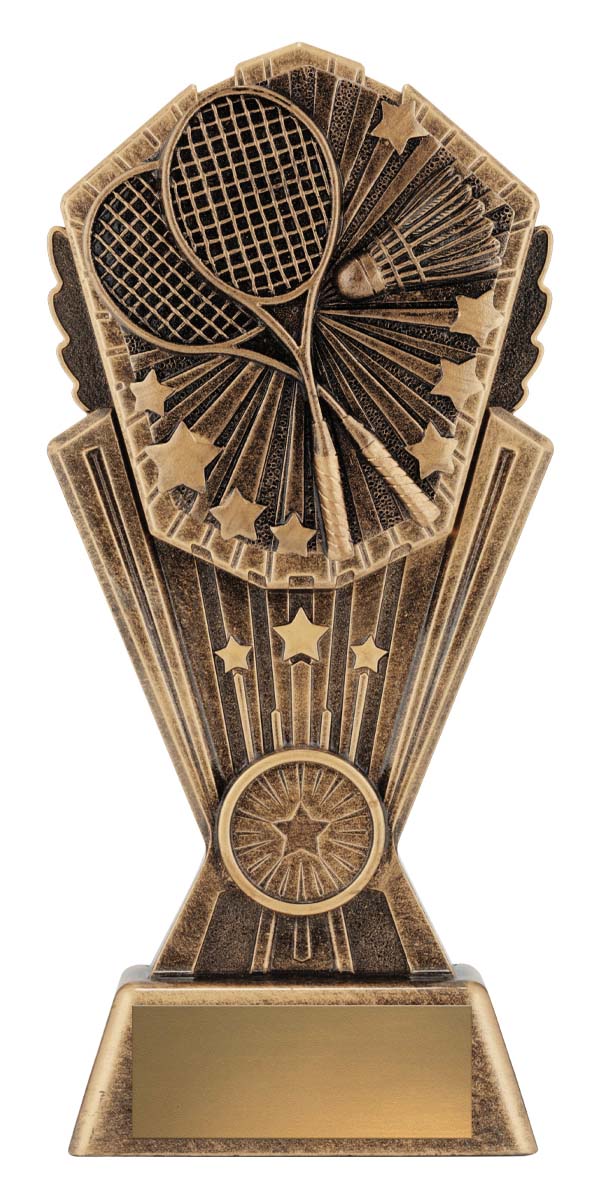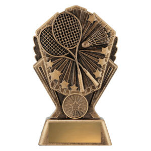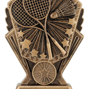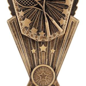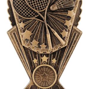 This contemporary badminton trophy features a modern circular frame and curved design in silver and gold. Highlighted with racquet and shuttlecock details, it offers a sleek look that suits schools, clubs, and championship events.