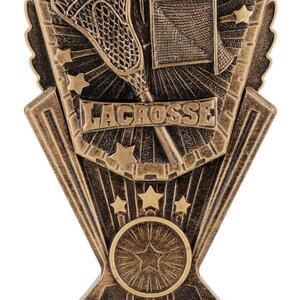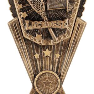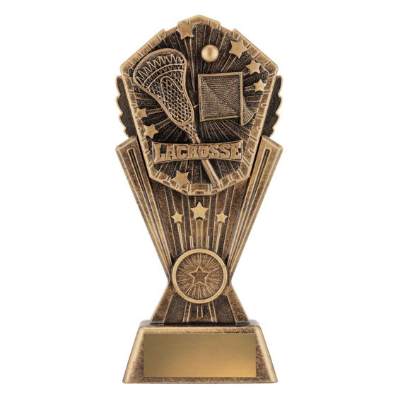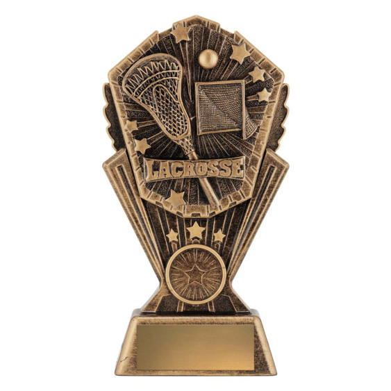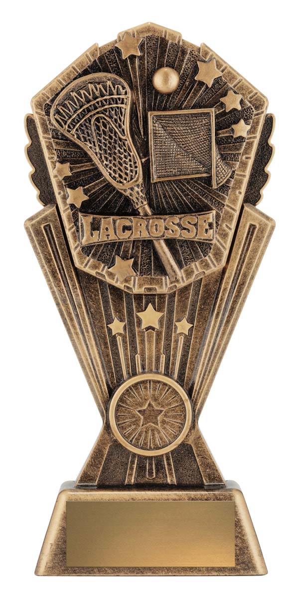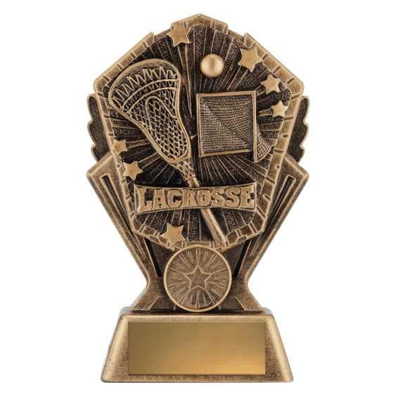 This antique gold resin lacrosse trophy features a detailed stick, goal and ball within a bold starburst frame. A perfect way to celebrate lacrosse achievements at any level. Includes space for custom engraving.