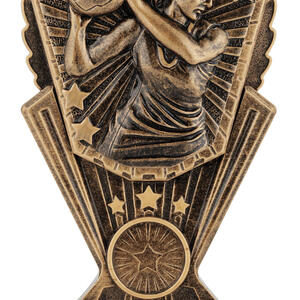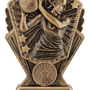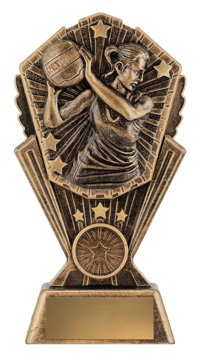 Crafted in a sophisticated gold finish, this netball trophy captures the energy and dedication of the game. Showcasing a netball player in action with a prominently labelled ball, the award is accented by star motifs and a circular emblem at the base. Ideal for netball trophies presentations, it offers a memorable tribute to sporting achievement.