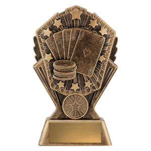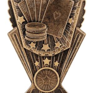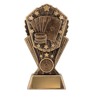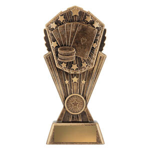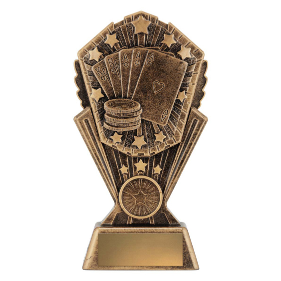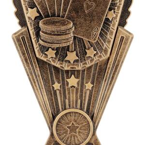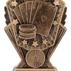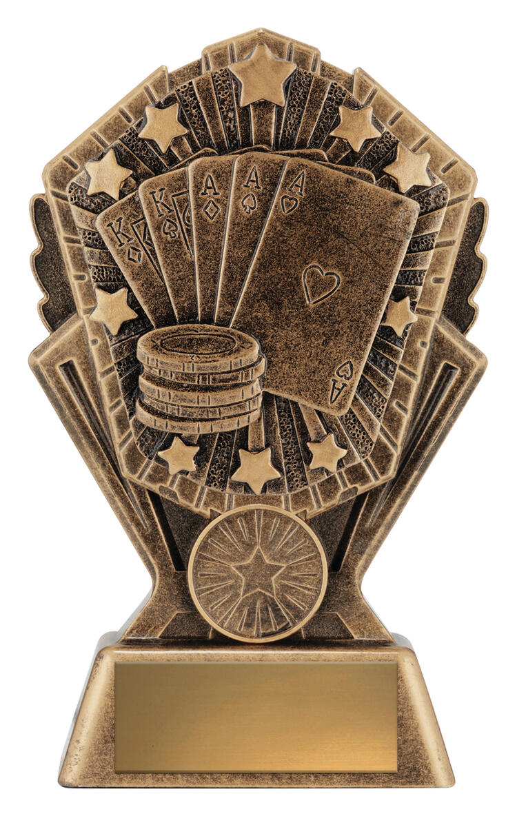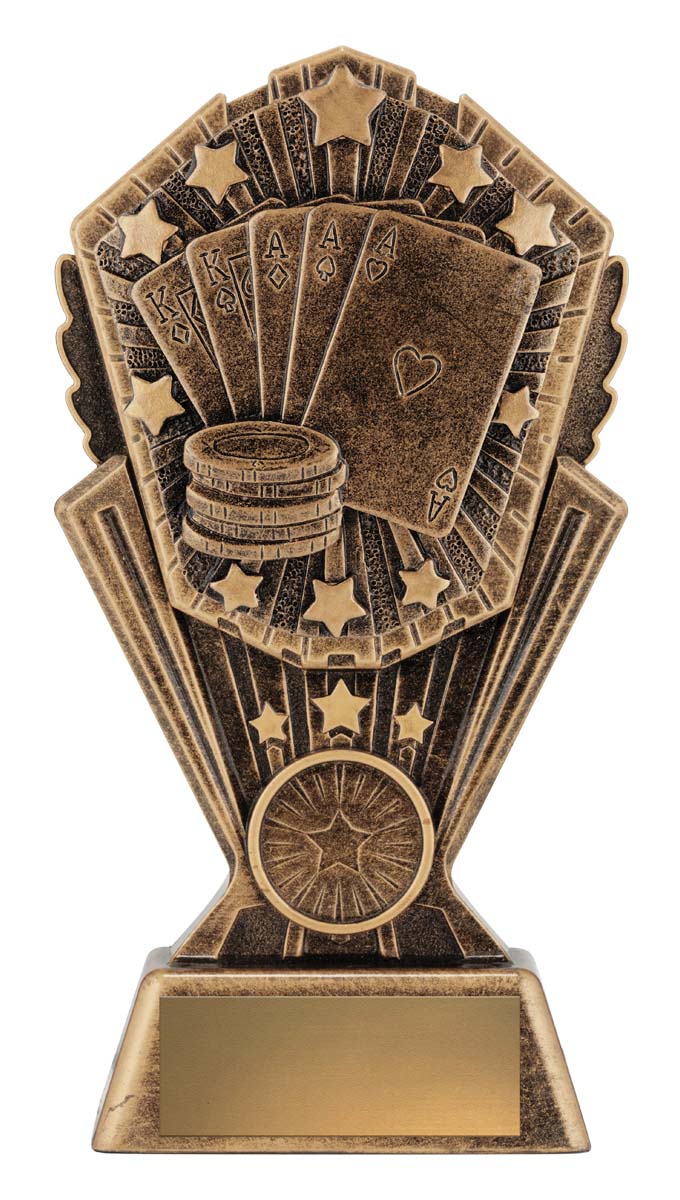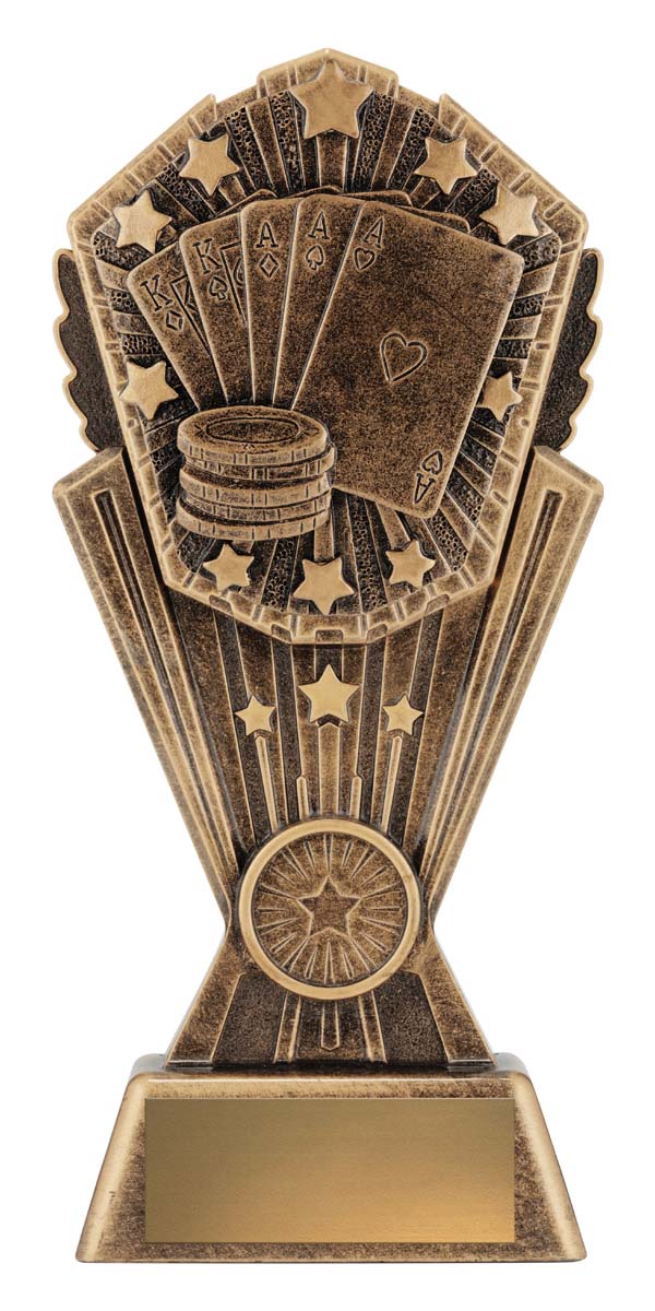 From the Cosmos series, this antique gold trophy showcases a fan of playing cards and poker chips framed by a starburst design. Crafted from solid resin, itÂ’s an impressive and affordable way to recognise poker or gaming achievements.
