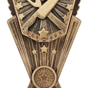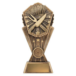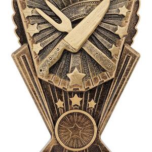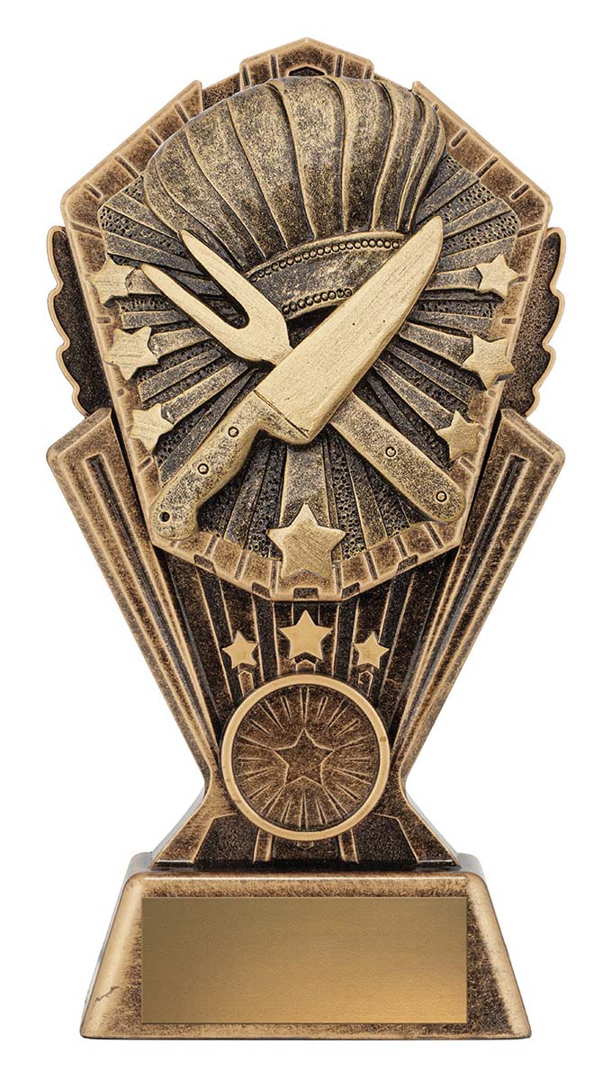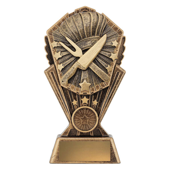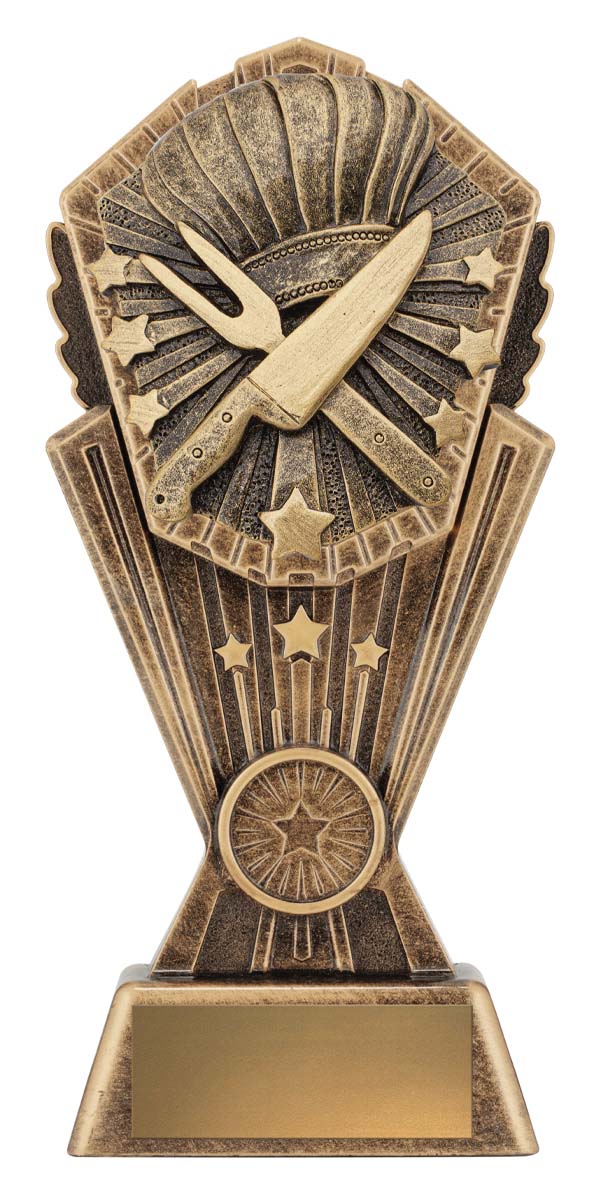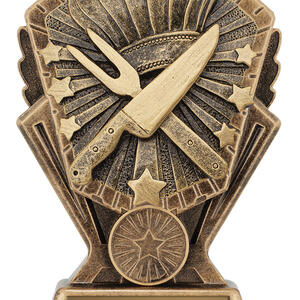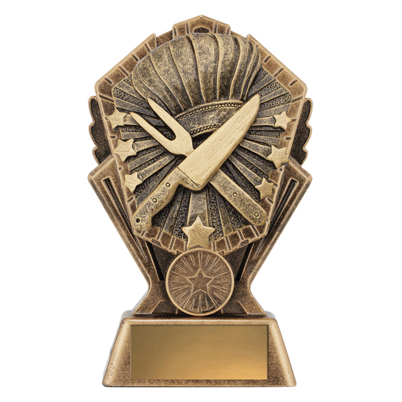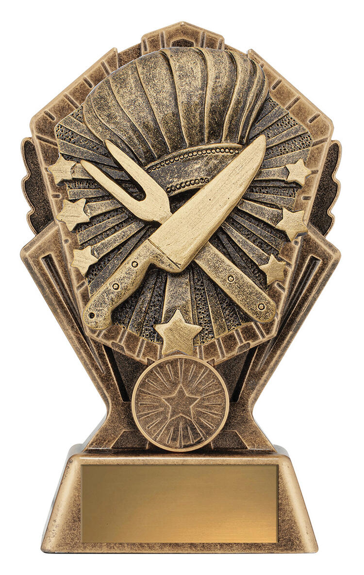 The Cosmos Cooking Trophy features a detailed gold and bronze resin design with a chefs knife and fork crossed in front of a chefs hat. Its starburst backdrop and solid base make it a standout award for chefs, bakers, and cooking contests.