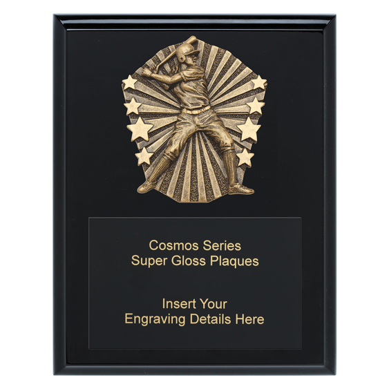 Stylish resin baseball trophy featuring a fefemale batter in mid swing against a starburst backdrop. Antique gold finish over a black base adds impact and professionalism. A timeless option for MVP or best batter awards.