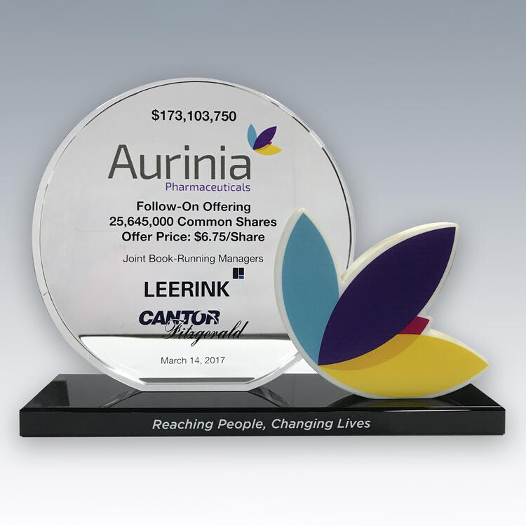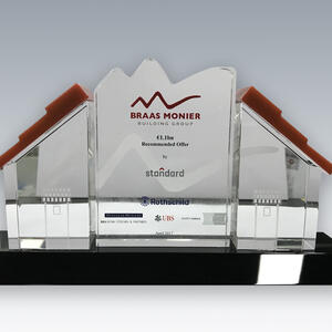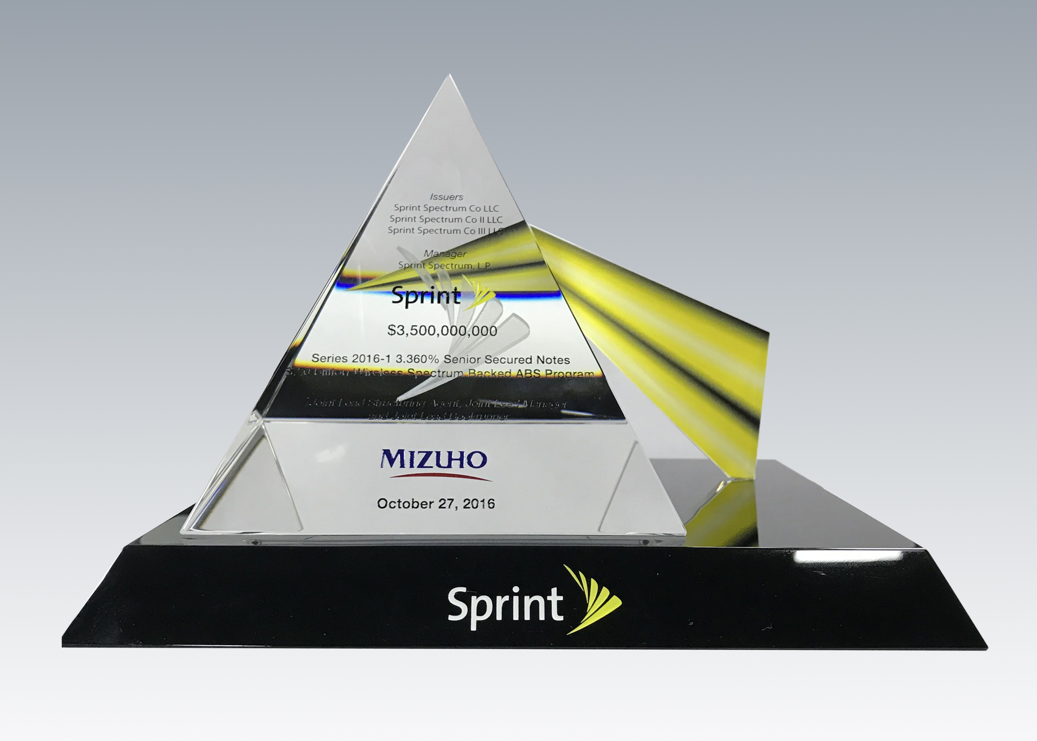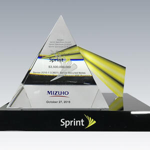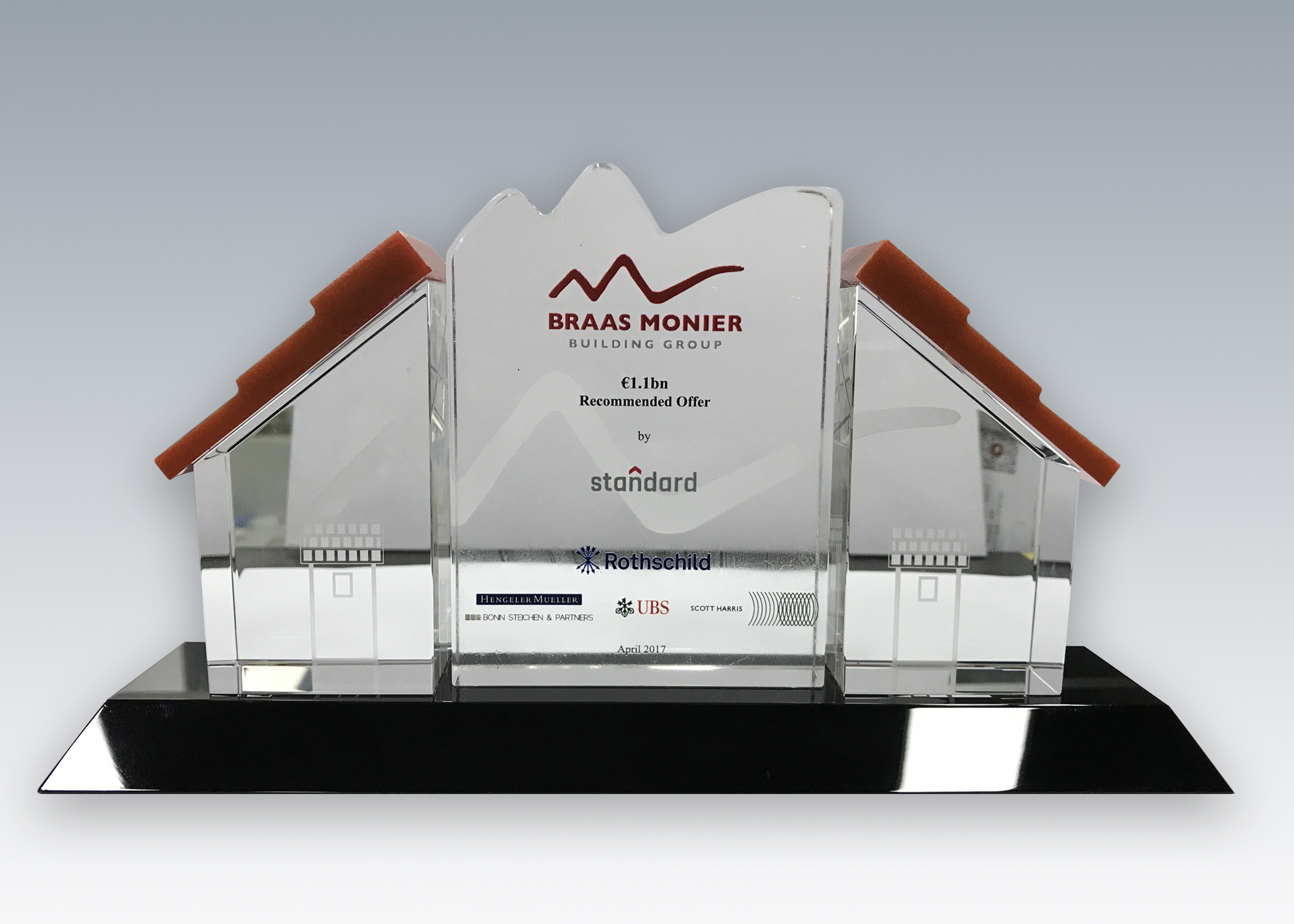 Different layers of optical crystal are assembled to form a striking, dimensional piece. Etching and full-colour print can be applied to highlight key details and branding, producing a truly iconic financial tombstone.