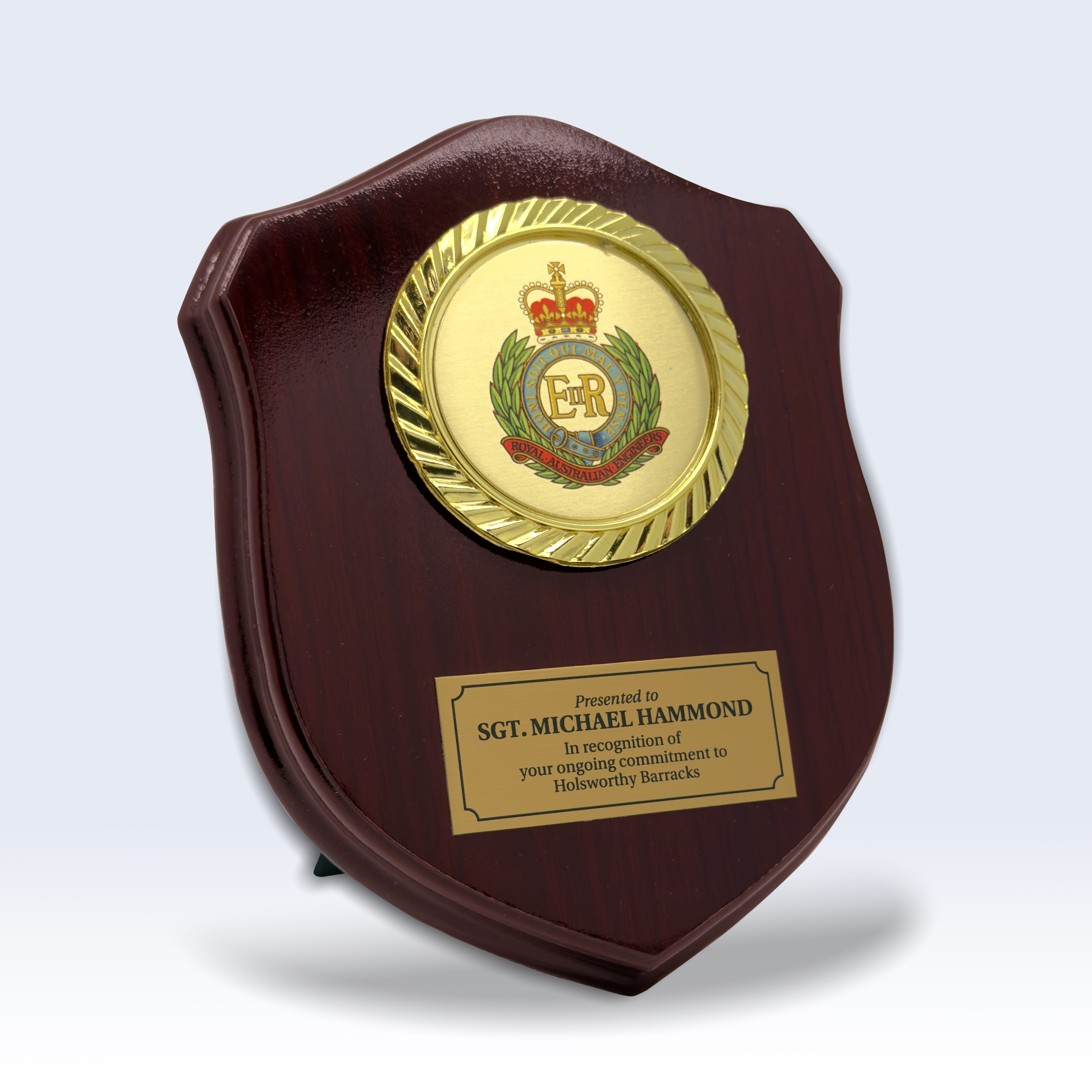 The Holsworthy Crest Shield Trophy offers a classic style with a polished mahogany foil finish and a classy gold trim. Standing 160mm high, it features a 50mm custom-printed full colour emblem and a matching full colour title plate to showcase your event or award details. It's ideal for small quantities and quick-turnaround requirements, and has no mould set up costs.