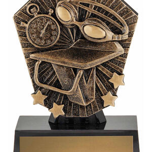 This compact swimming trophy captures the essence of competitive achievement with its gold and black design, star accents, and a stable base. Featuring a stopwatch, swimming goggles, and a diving board, it artfully celebrates the discipline and dedication of swimmers. An excellent addition to any collection of swimming trophies, this piece is both durable and visually striking.