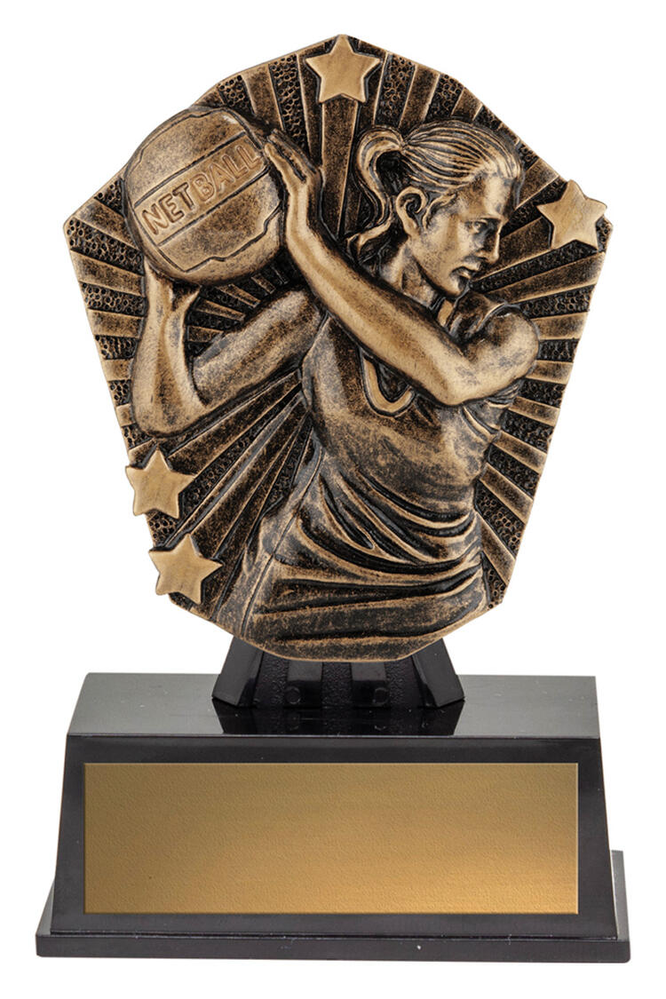 Crafted for distinction, this netball trophy pairs a gold and black finish with a sturdy rectangular base and a decorative plaque. The standout design features a netball player poised with the ball, framed by celebratory star motifs and the sport's name. An ideal choice for memorable netball awards, it embodies achievement and the spirit of the game.