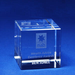 A compact solid crystal cube with polished faces and pristine clarity. Ideal as a desk award, paperweight or small scale recognition gift for employees and business partners.